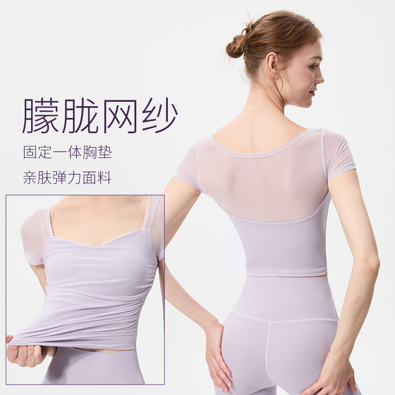 ヨガの服の女性のネットの糸は胸のパッドの固定の一体の杯の半袖をつないで身を修めてやせている上着を現します。