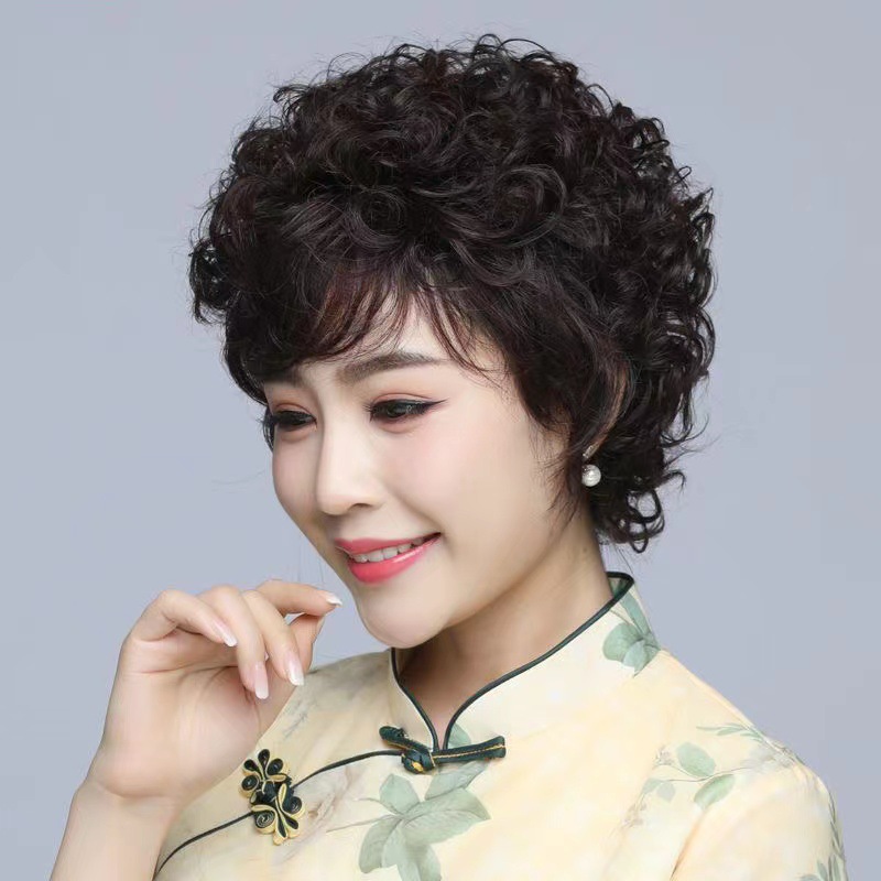 中老年假发女妈妈款气质短卷发斜刘海蓬松全头套仿真发丝现货批发