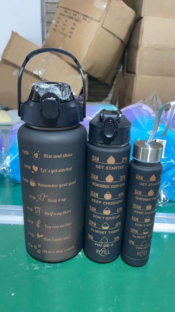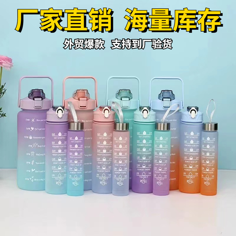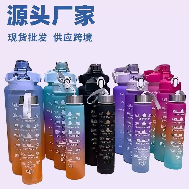 跨境爆款现货大容量塑料杯三件套渐变色水杯便携户外套装直身水瓶