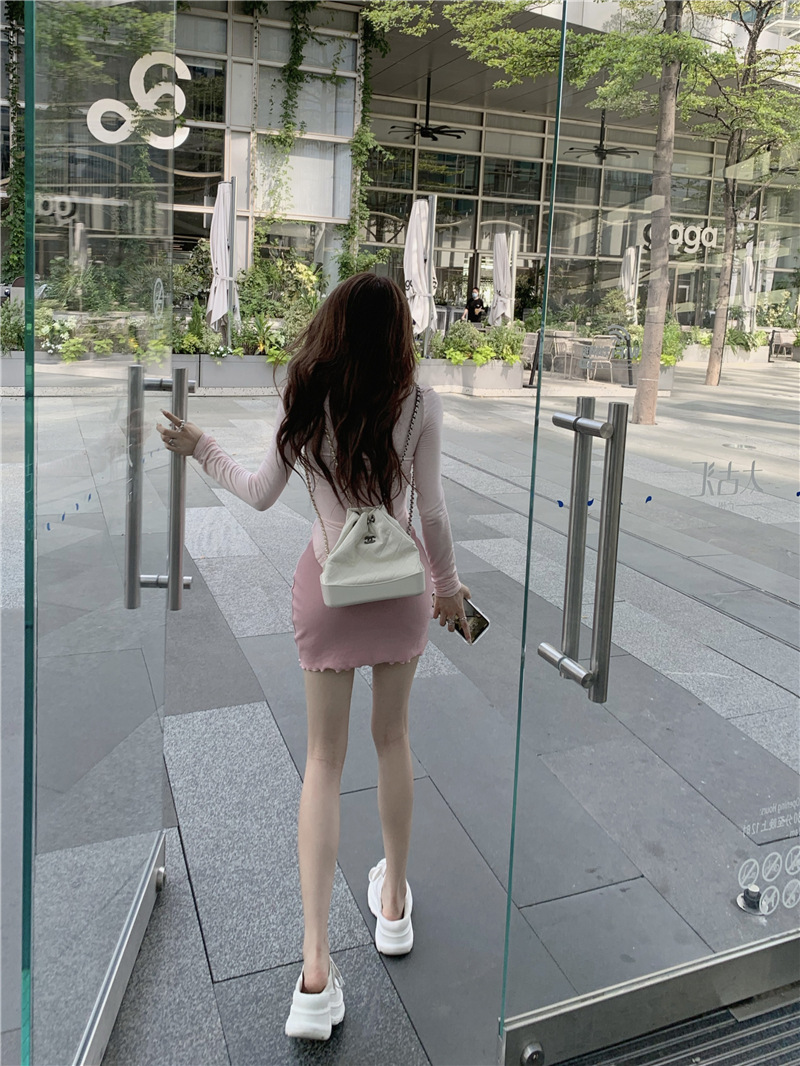 ギャルの低い胸のvネックの長袖のワンピースの女性の早い春の新型のネットの赤い紫色の弾力性のセクシーなa字のお尻のスカート