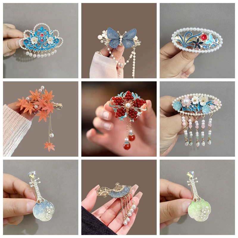 新中式扇形珍珠流苏发夹高级感枫叶发卡古风汉服旗袍发饰鸭嘴夹女