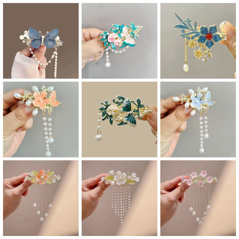 古代スタイルのブルーヘアアクセサリーサイドクリップ中国風漢服頭飾り祥雲パールタッセル蝶カモノハシクリップレトロ女性