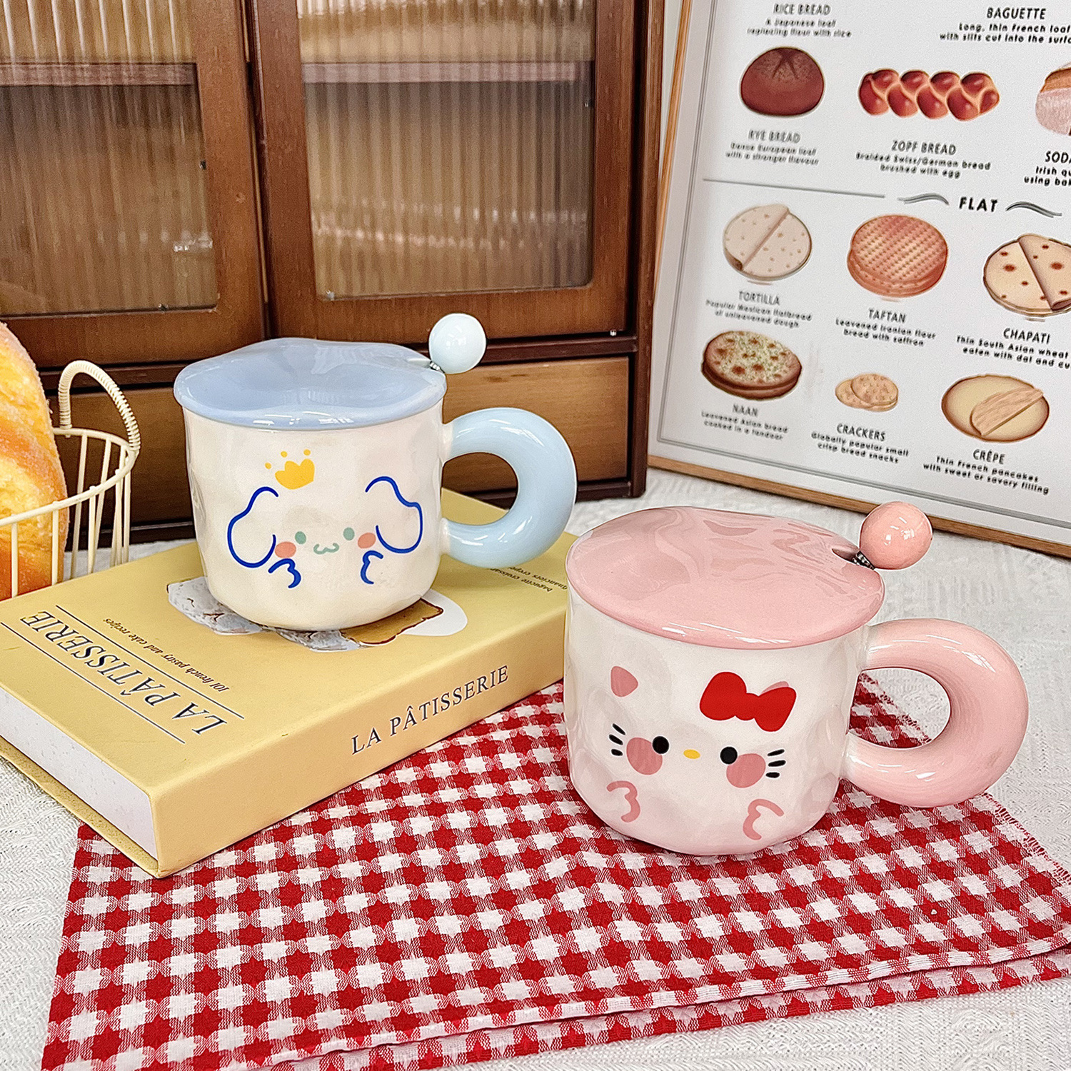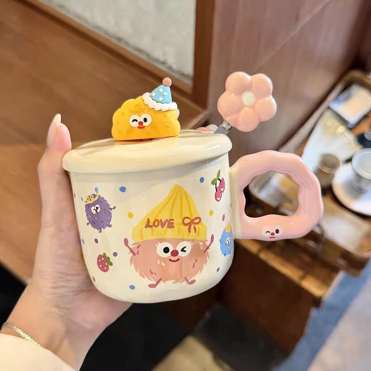 セラミックマグカップ蓋付きスプーン高颜値カップお土産女性家庭用カップかわいいカップルコーヒー朝食カップ