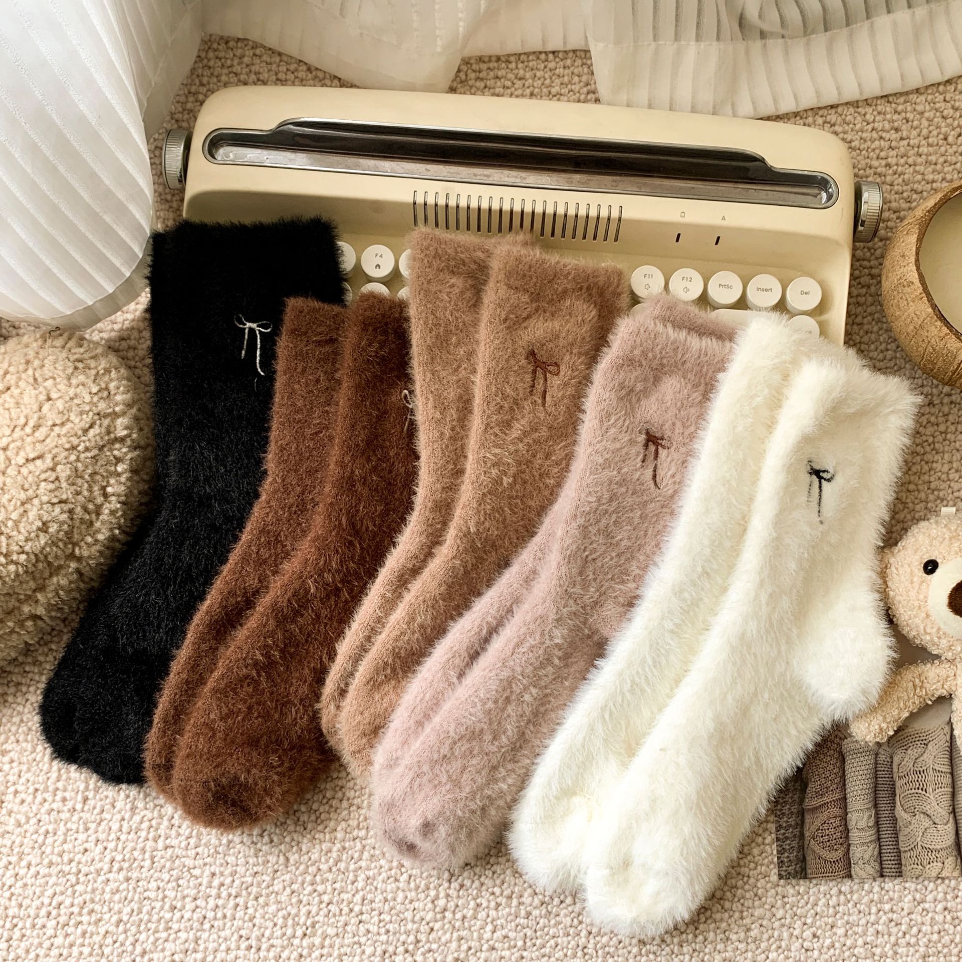 秋冬款咖色蝴蝶结刺绣女袜加绒加厚保暖袜居家地板中筒袜睡眠袜子