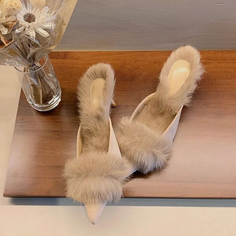 毛毛高跟鞋女秋冬天外穿细跟时尚加绒女鞋气质半包穆勒鞋拖鞋女潮