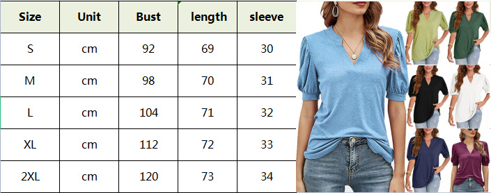 欧米クロスボーダー女装2023アマゾン夏新作カジュアルvネック純色泡袖ゆるいtシャツ女性