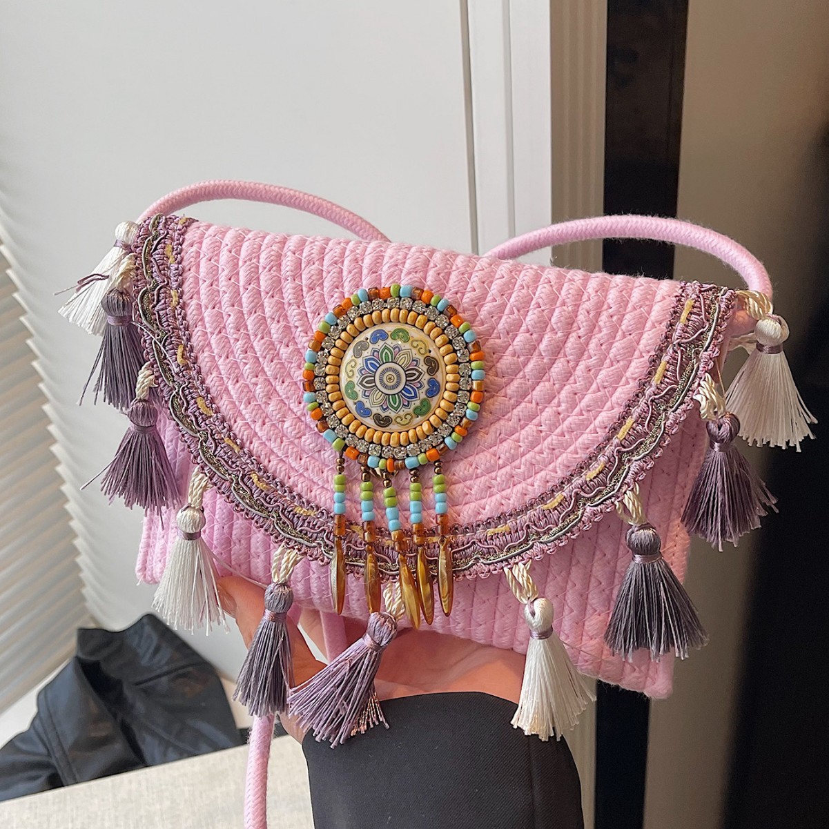 ボヘミアン民族風バッグ女性2025新型フリンジ編みバッグビーチ休暇シングル肩斜め掛け携帯バッグ