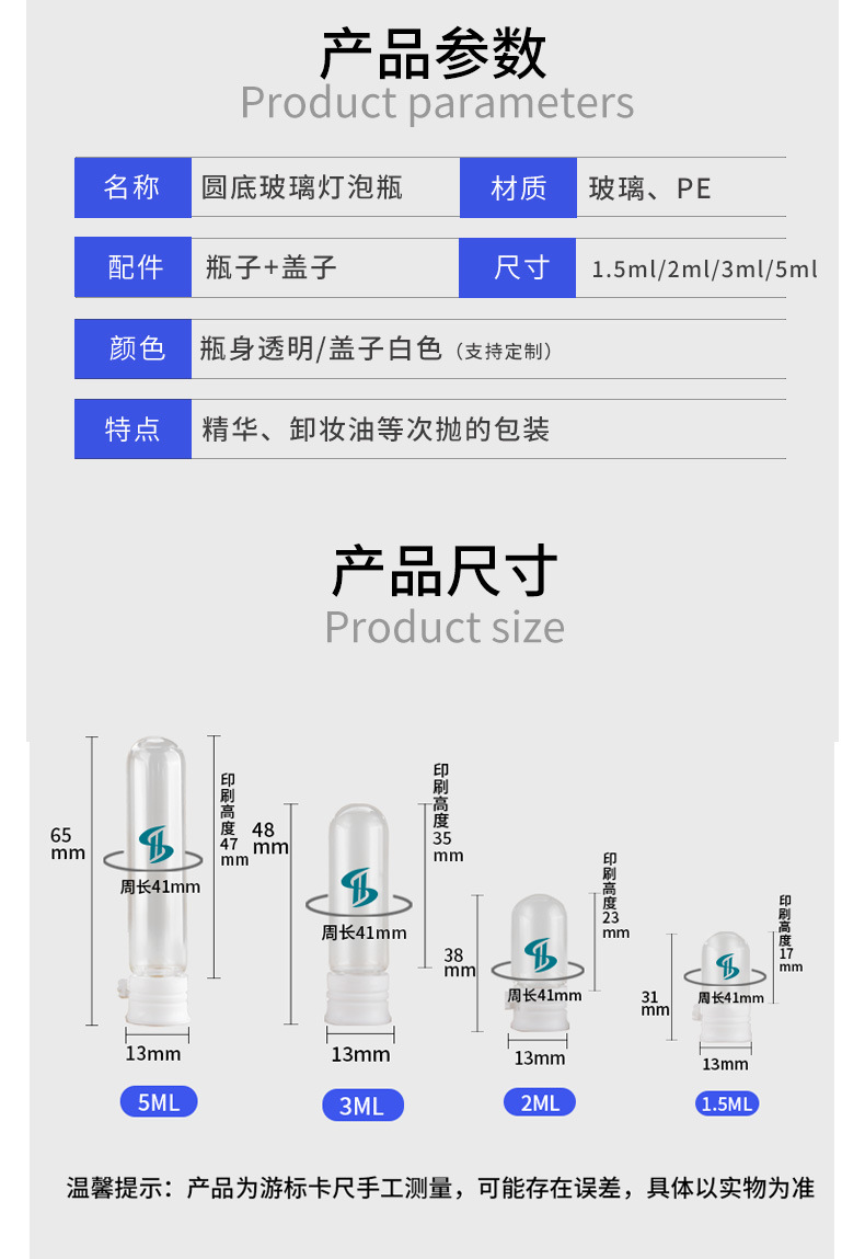 2ml丸底電球型ボトル エッセンス原液サンプルボトル クレンジングオイル使い切りボトル ダブルカプセル式ティアオフキャップガラスボトル
