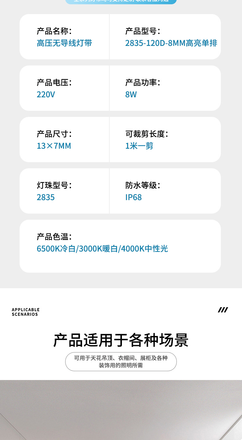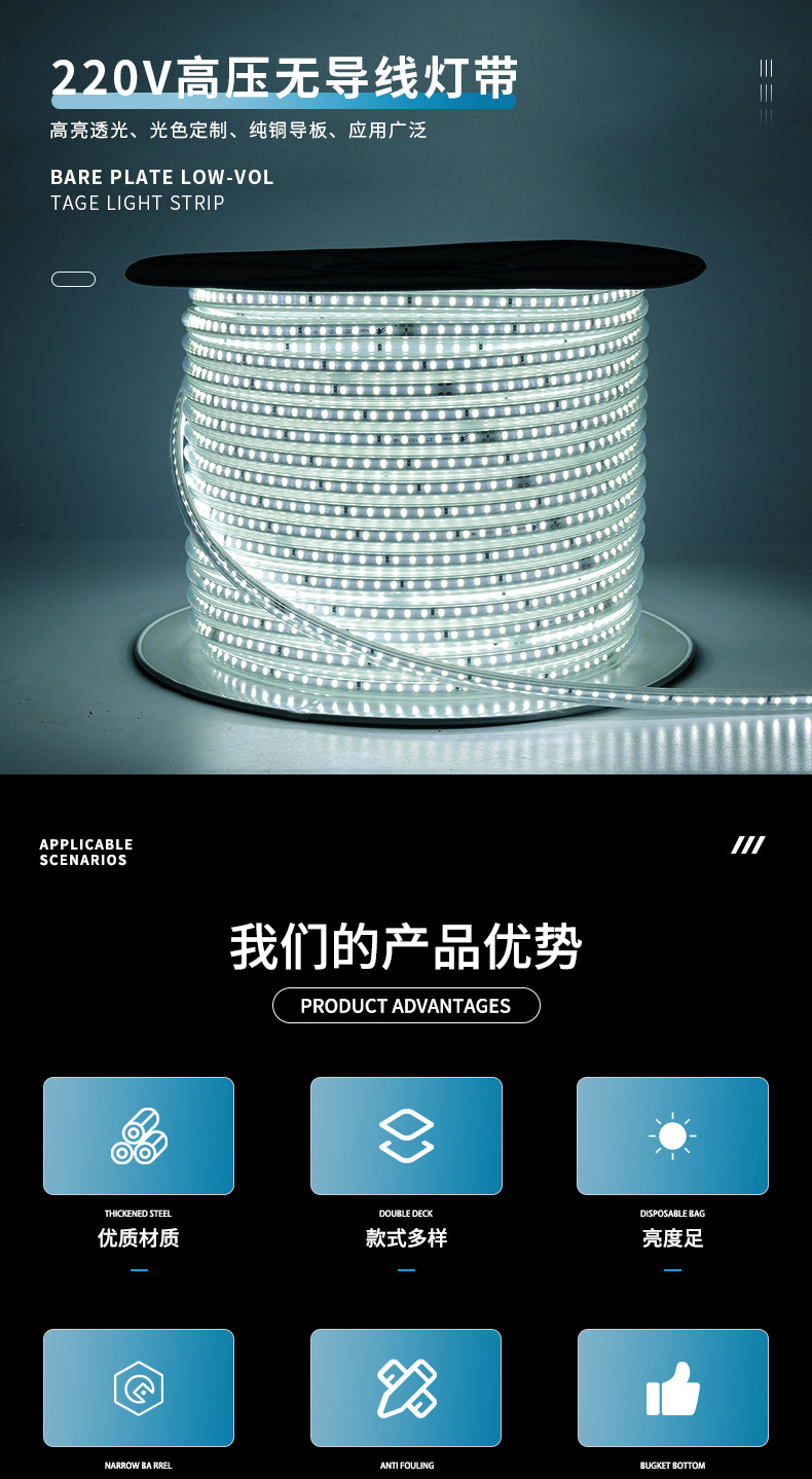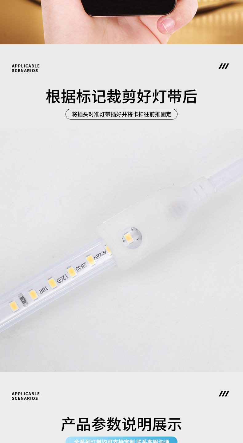 产品规格 电压:220V高亮防水120珠一米透镜灯带