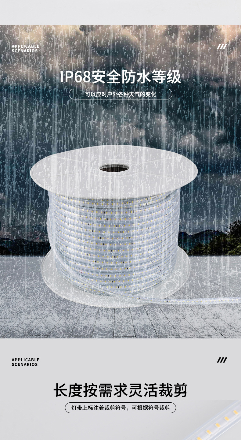 高压220VLED灯带户外无导线超亮防水2835灯珠120珠单排透镜灯带