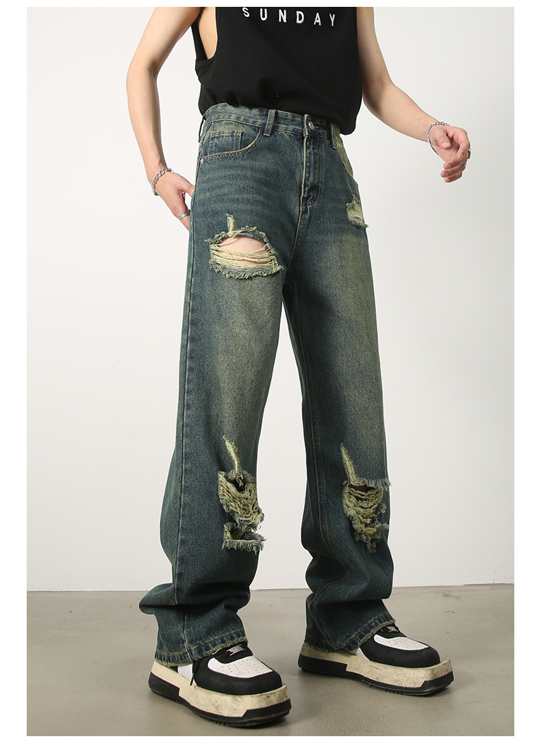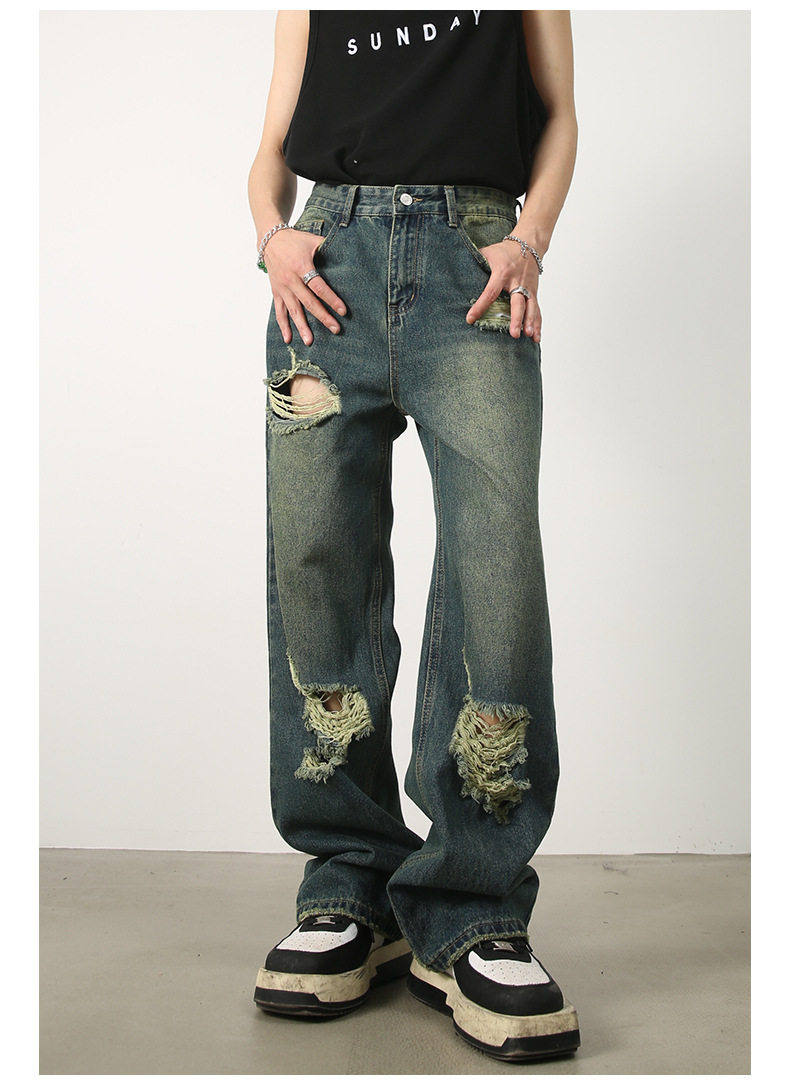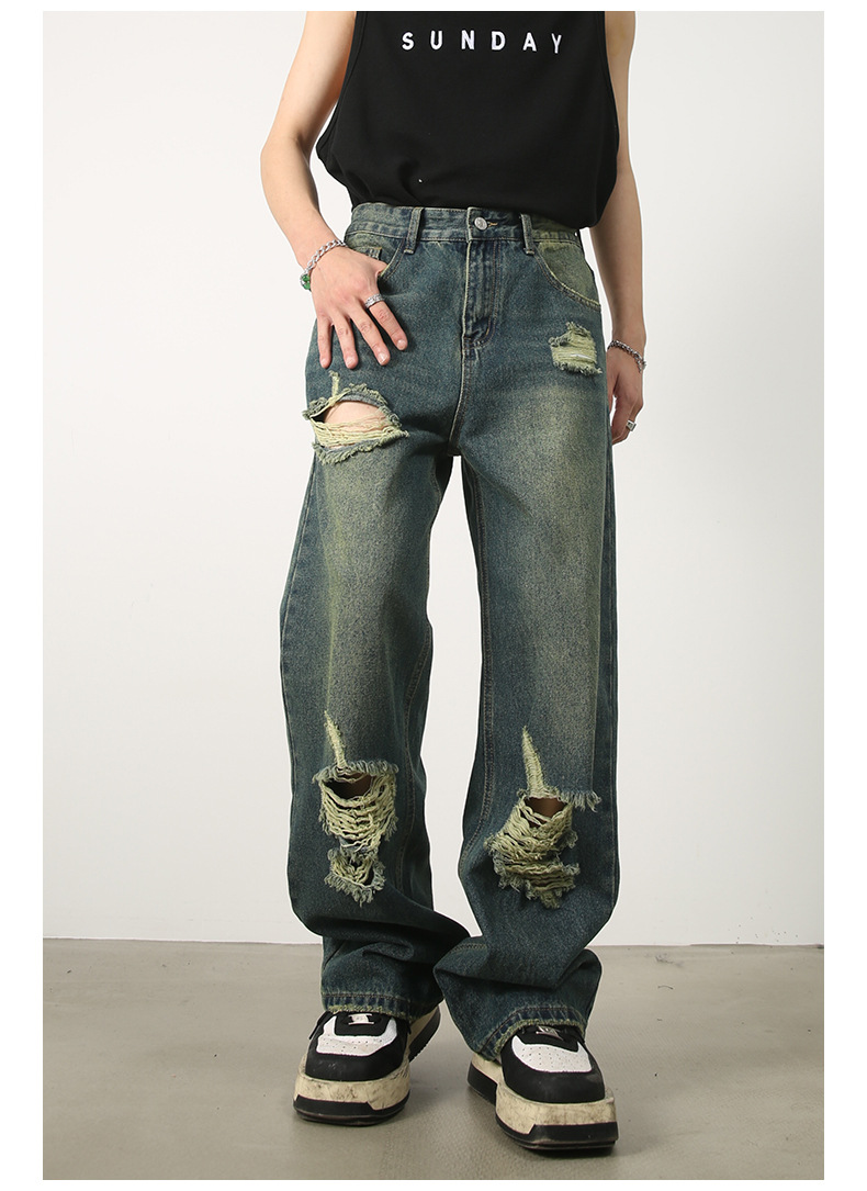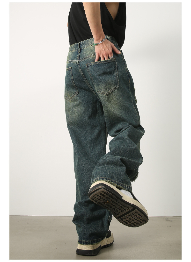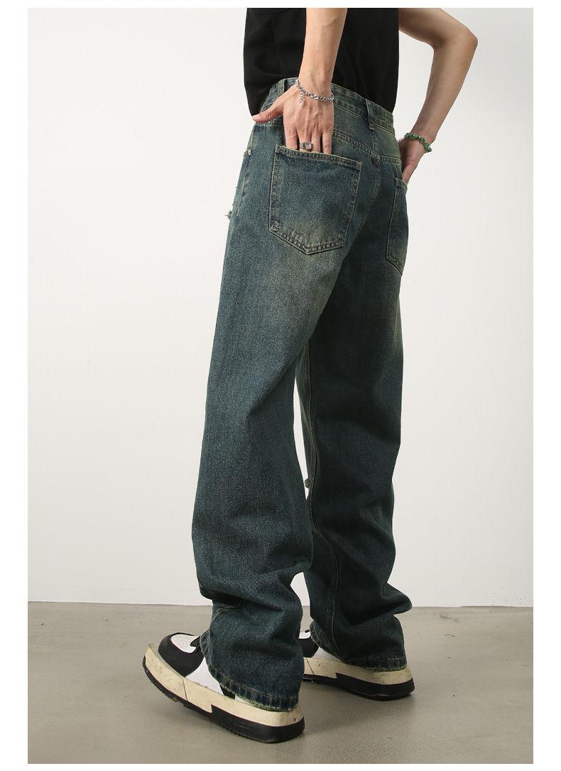 nirben | アメリカンレトロウォッシュジーンズメンズハイエンドシンプルで多用途なルーズリップドワイドレッグパンツ