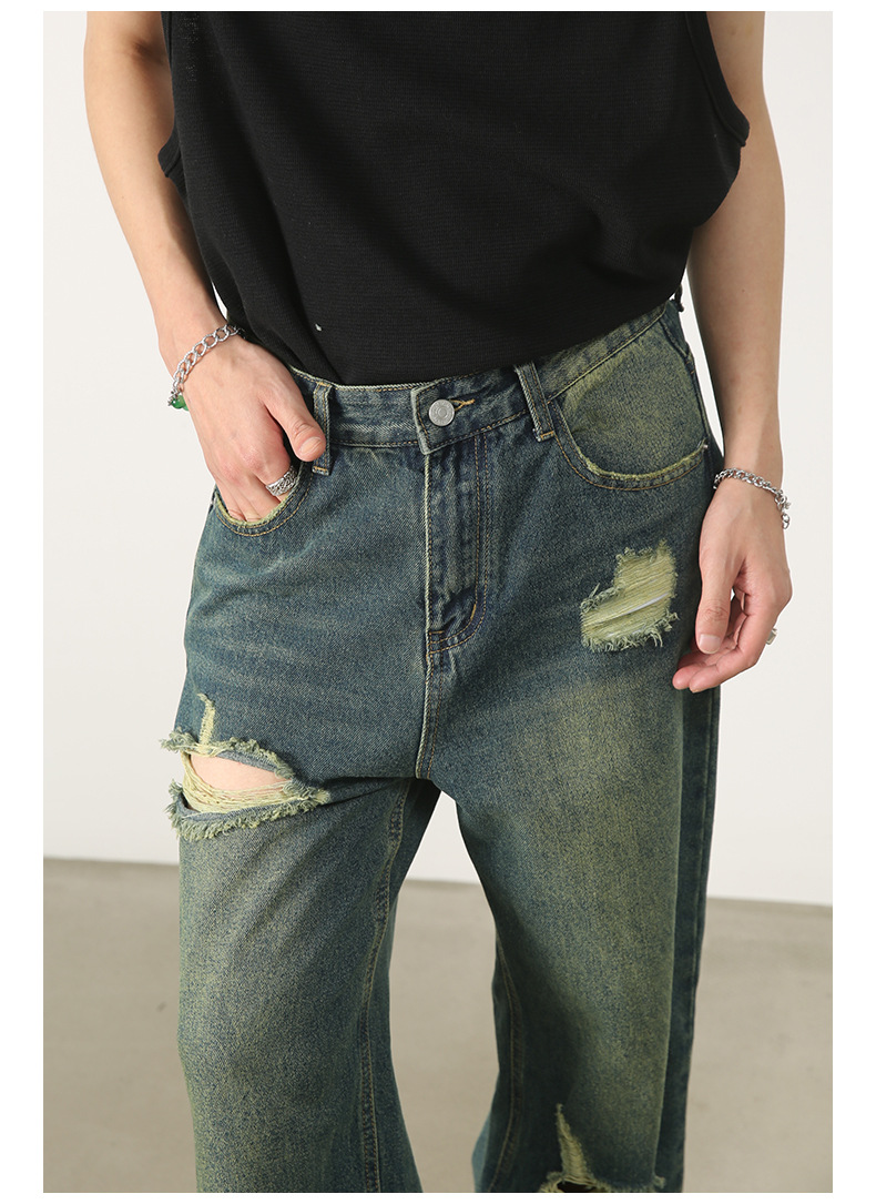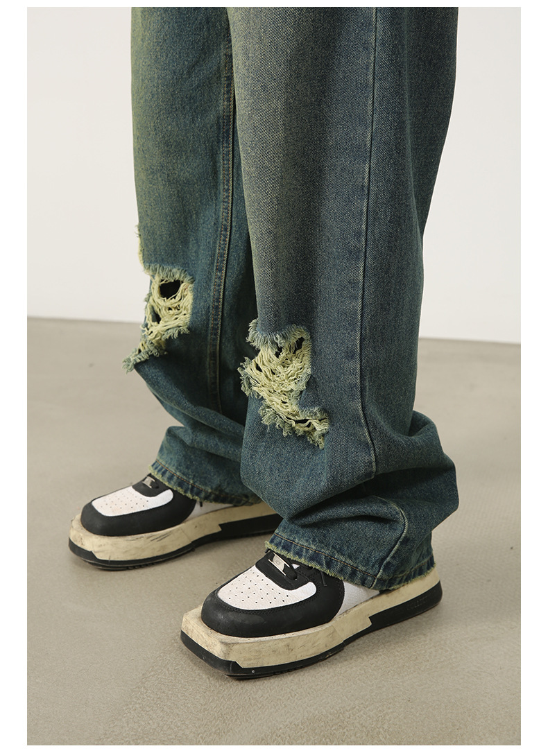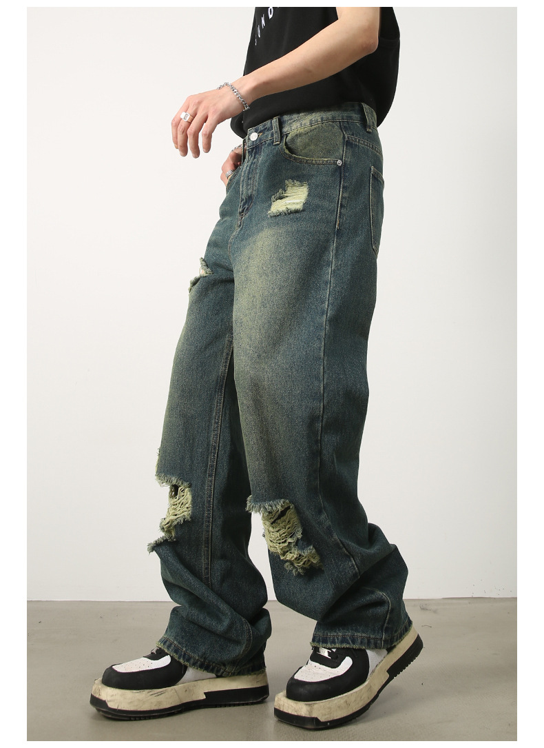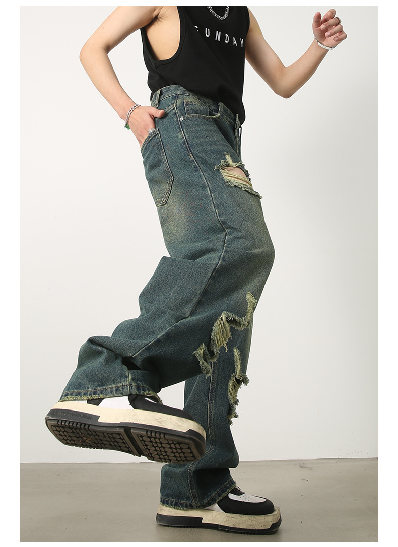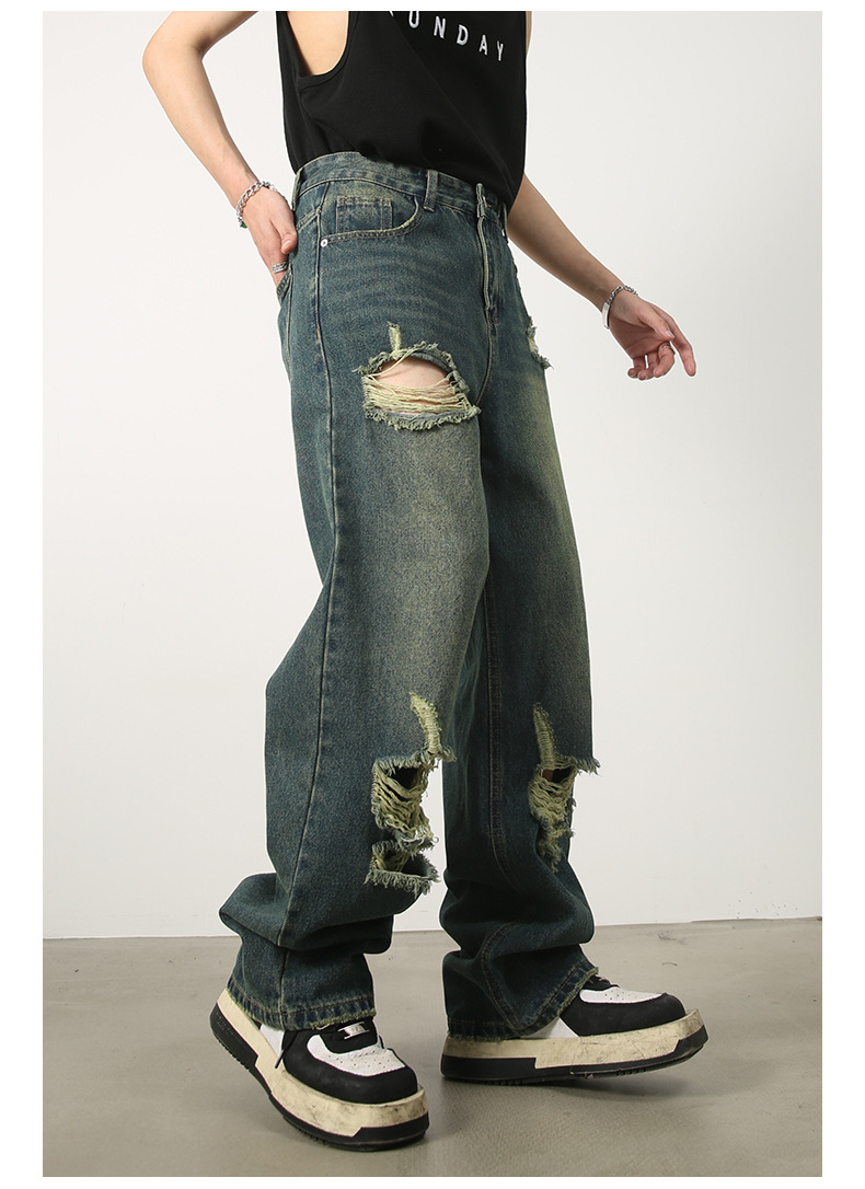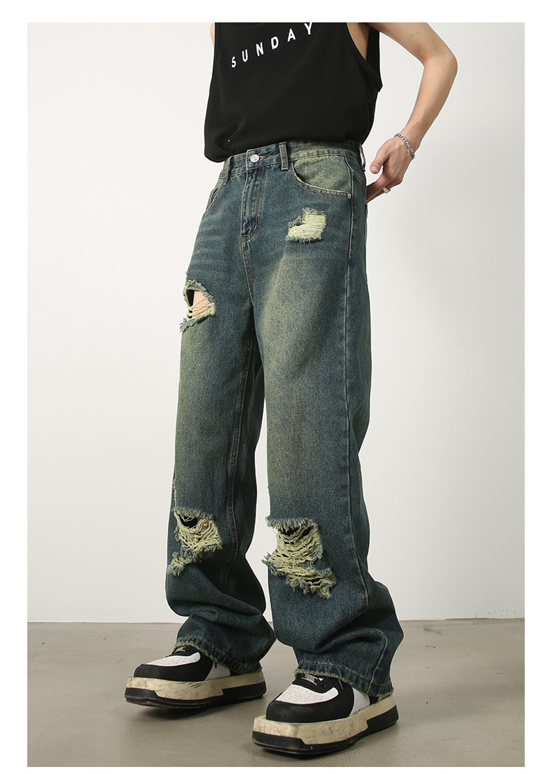 nirben | アメリカンレトロウォッシュジーンズメンズハイエンドシンプルで多用途なルーズリップドワイドレッグパンツ