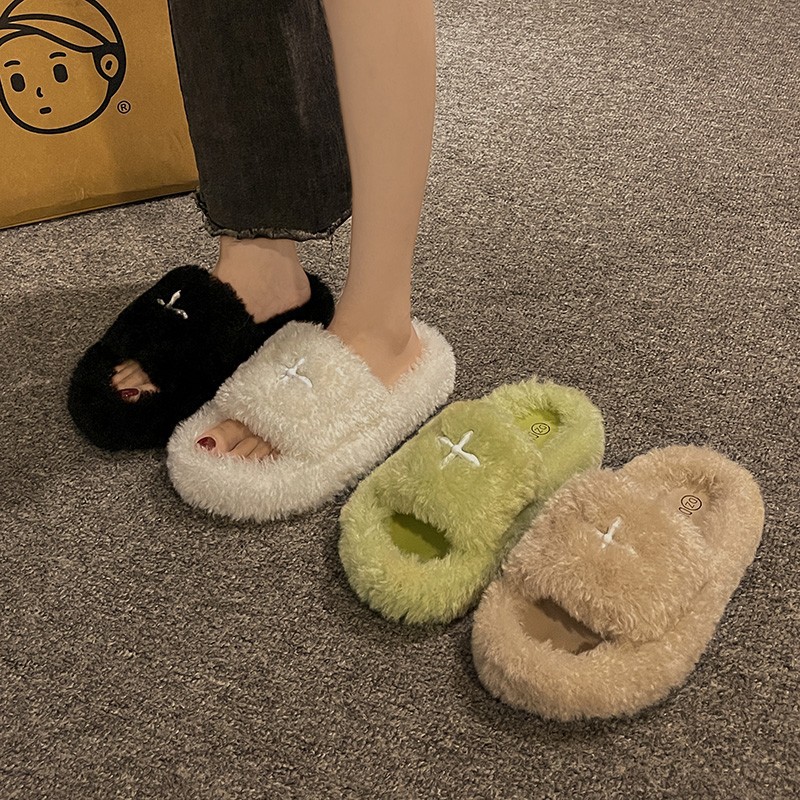 2025年秋冬向け、厚底ファー付きスリッパ、女性用、室内用、怠け者向け、ワンラインデザイン、綿スリッパ、トレンド、卸売