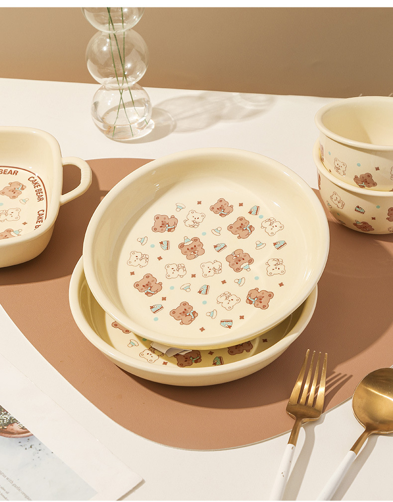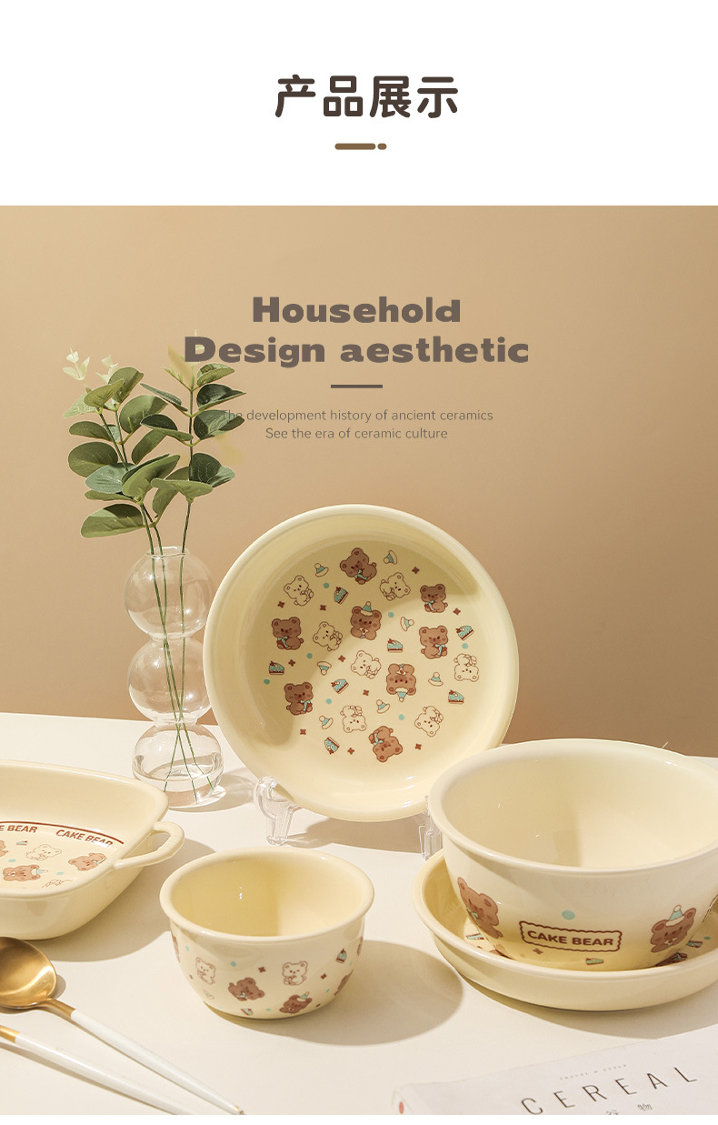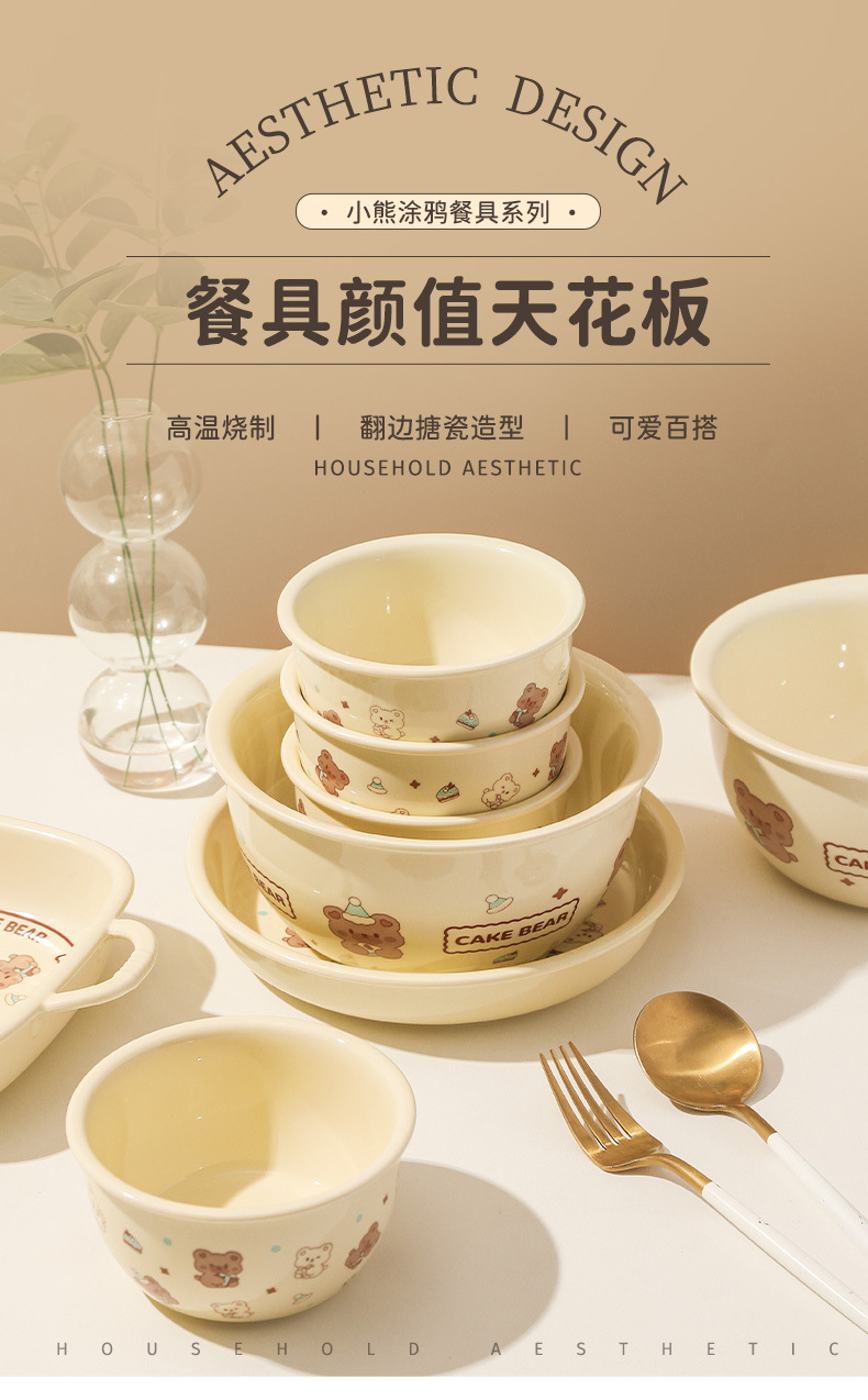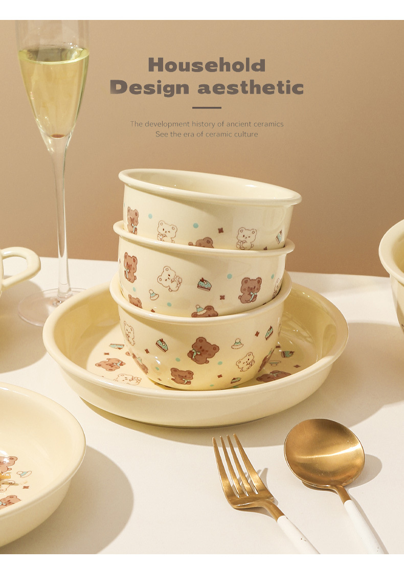 クリーム系漫画セラミックボウル皿笠ボウル熊かわいい食器インスタ风ボウル皿セット家庭用アイデア