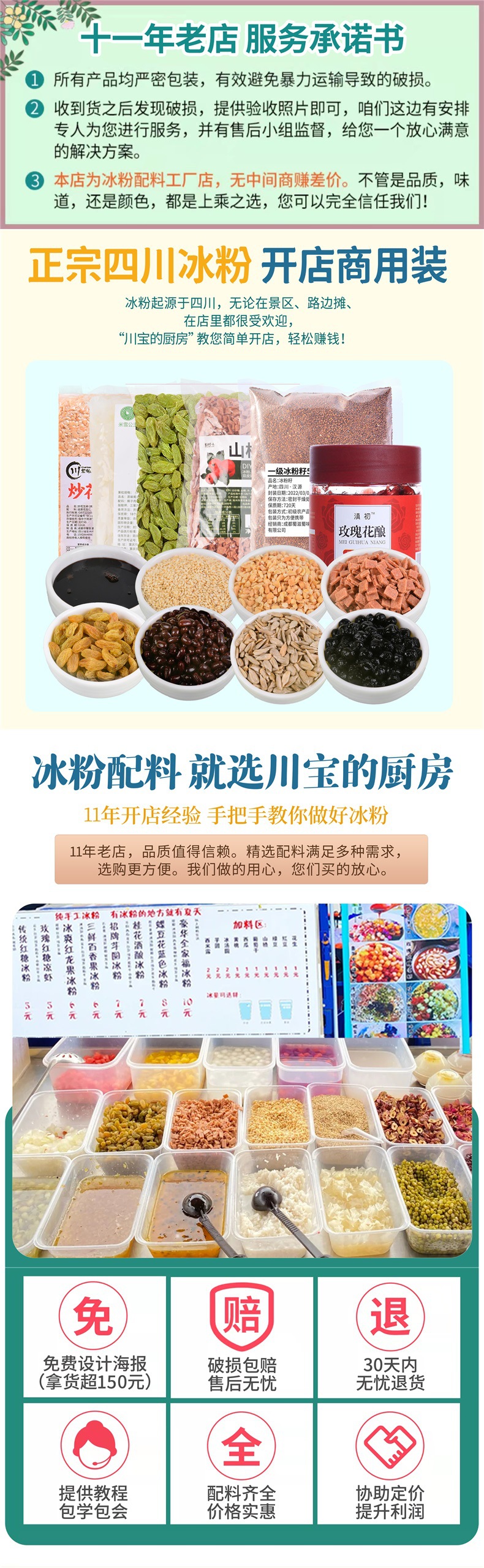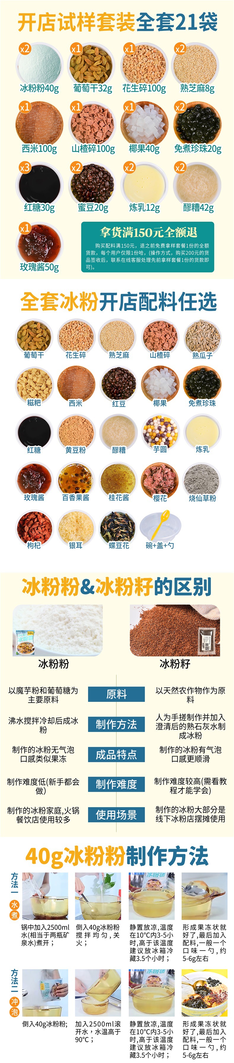 パッケージ仕様 氷粉40g (8杯 ~ 10杯できる),アイスパウダー出店サンプルセット,氷粉の具材-サンザシの粉砕1斤,氷の粉の原料-ピーナッツの粉砕1斤,氷粉の具材-糖蜜赤豆1斤,アイスクリームの原料-新疆レーズン1斤,氷の粉の原料-純粋なココナッツの果実の1斤,氷粉の具材-熟白ゴマ半斤,氷粉の具材-熟瓜子仁1斤,氷粉の具材-黒真珠を1斤煮る,アイスクリームの原料-タイの西米1斤,氷粉の具材-三色のサトイモ円1斤,氷粉原料-米酒発酵槽2斤,アイスクリーム300g (大豆粉を送る),氷粉原料-液体紅糖450g,氷粉原料-液体紅糖6斤,ボトルジャム-ローズソース500g,瓶入りジャム-桂花醤500g,瓶入りジャム-百香果ソース500g,瓶-パンダ練乳350g,蜀滋蜀味アイスクリーム粉40g * 20袋(小箱入り),道具-アイスボウル + 蓋 + スプーン50セット,道具-具材タッパー4個