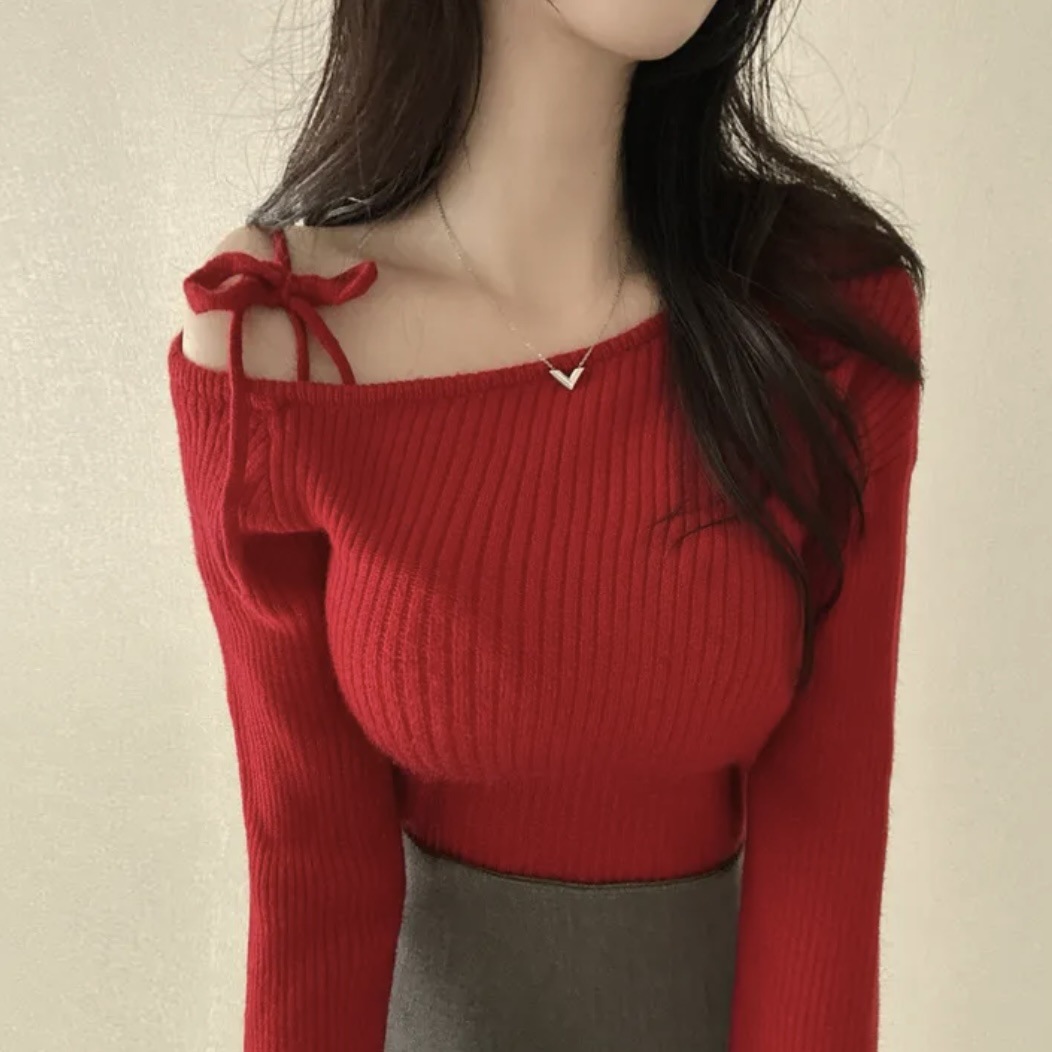 韓国版の早秋の婦人服のニットのセーターの不規則な斜めの襟の純粋な欲のギャルの風はニットの女性の上着を結びます。