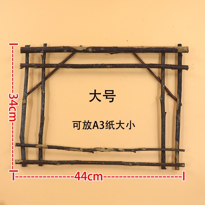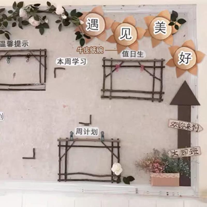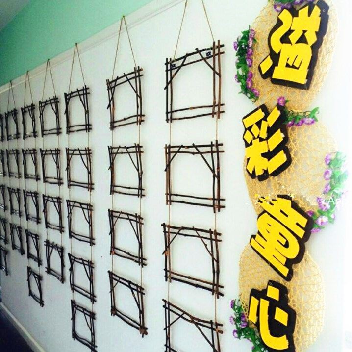 幼稚園藤編み飾り森系壁飾り教室美術絵画作品展示背景木の枠