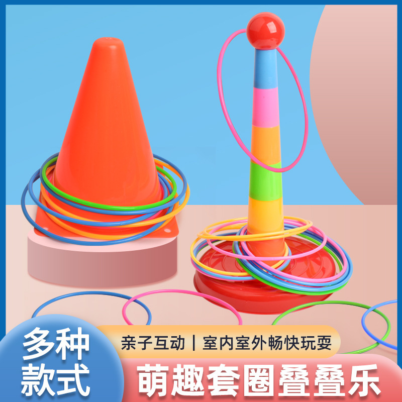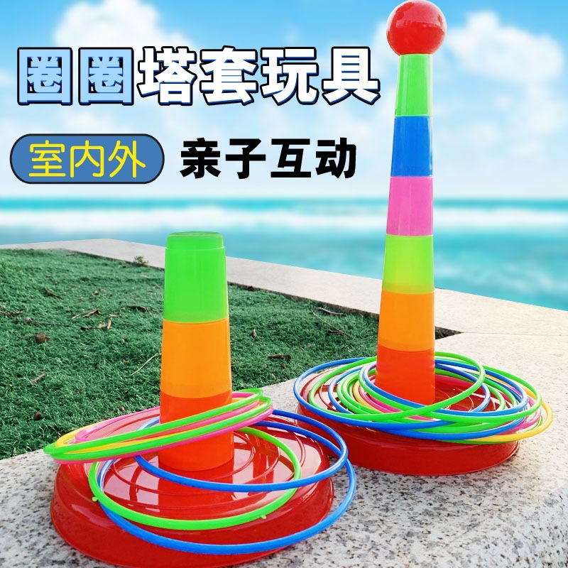 遊園地の場所の屋台は塔を投げて塔を重ねて子供の親子レジャーのおもちゃを投げます。