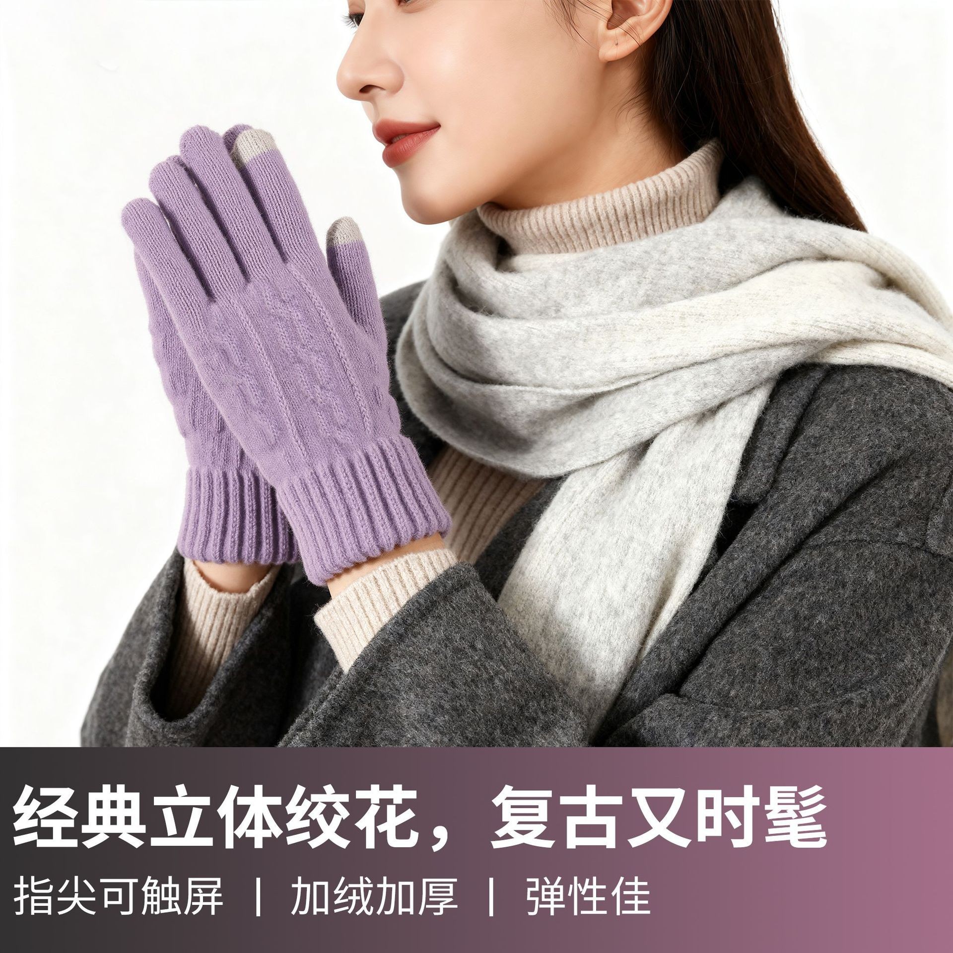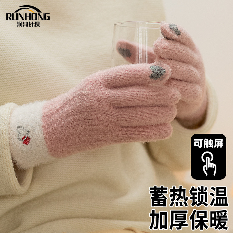 触屏女士可爱秋冬季针织防寒保暖加绒五指骑行车学生批发毛线手套