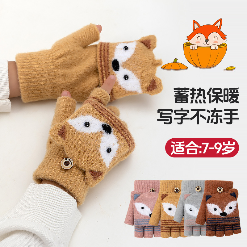 子供用冬ニット手袋卸売、フリップトップハーフフィンガー、男女兼用、防寒保温、漫画柄、サイクリング、学生用手袋