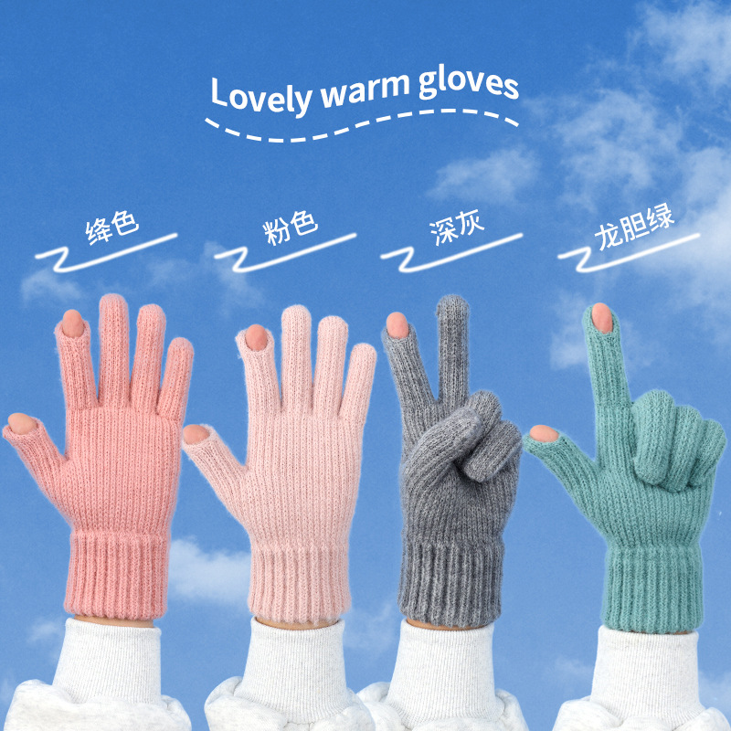 新款手套女冬季可爱卡通保暖学生玩手机写字露指触屏骑车针织毛绒