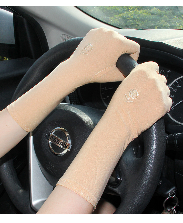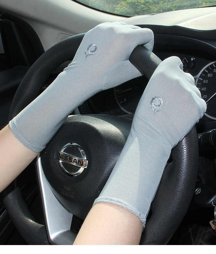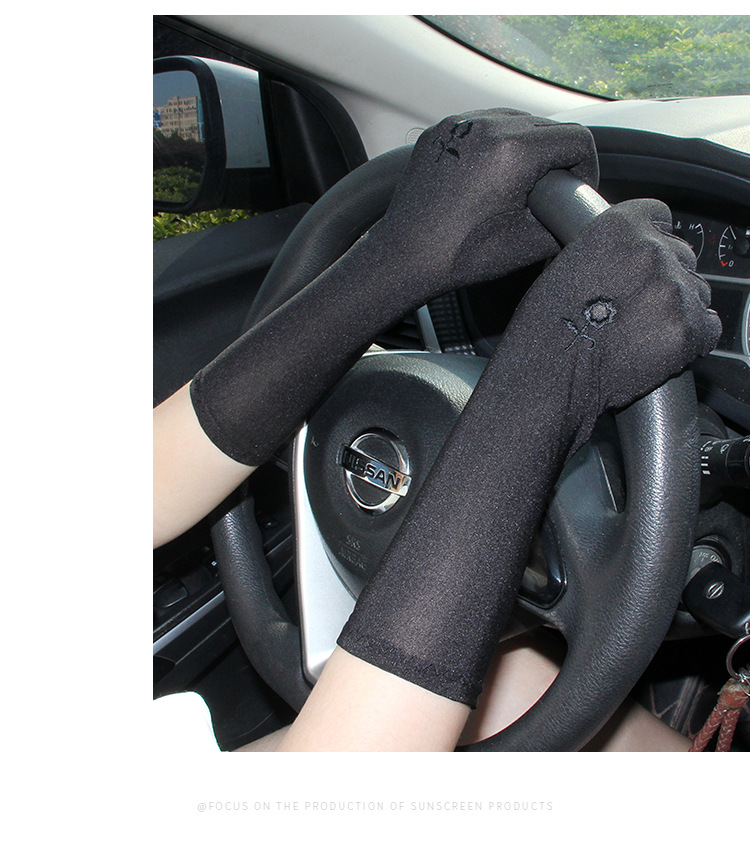 韓国のミディアムロング刺繍手袋女性春夏の薄い弾力性ミルク糸は車で日焼け止めの全指手袋に乗ります。