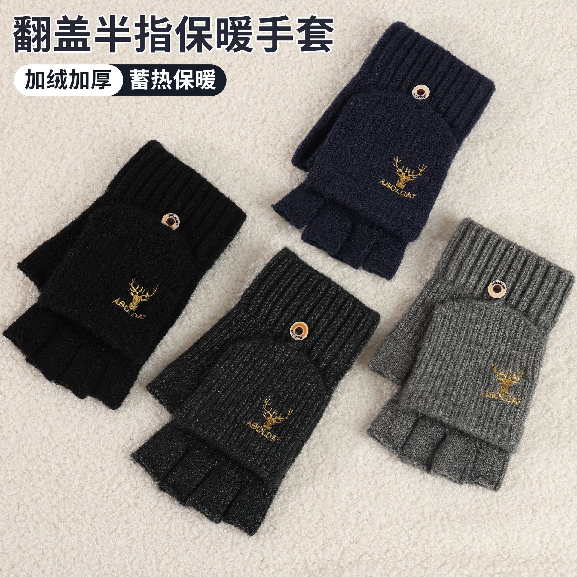 秋冬季男士翻盖半指刺绣麋鹿保暖加绒加厚针织骑车学生情侣手套