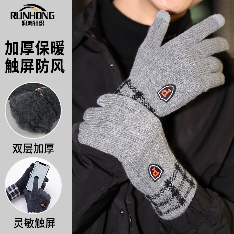 男款冬季针织手套双层加绒加厚防寒保暖户外骑行触屏手套加厚保暖
