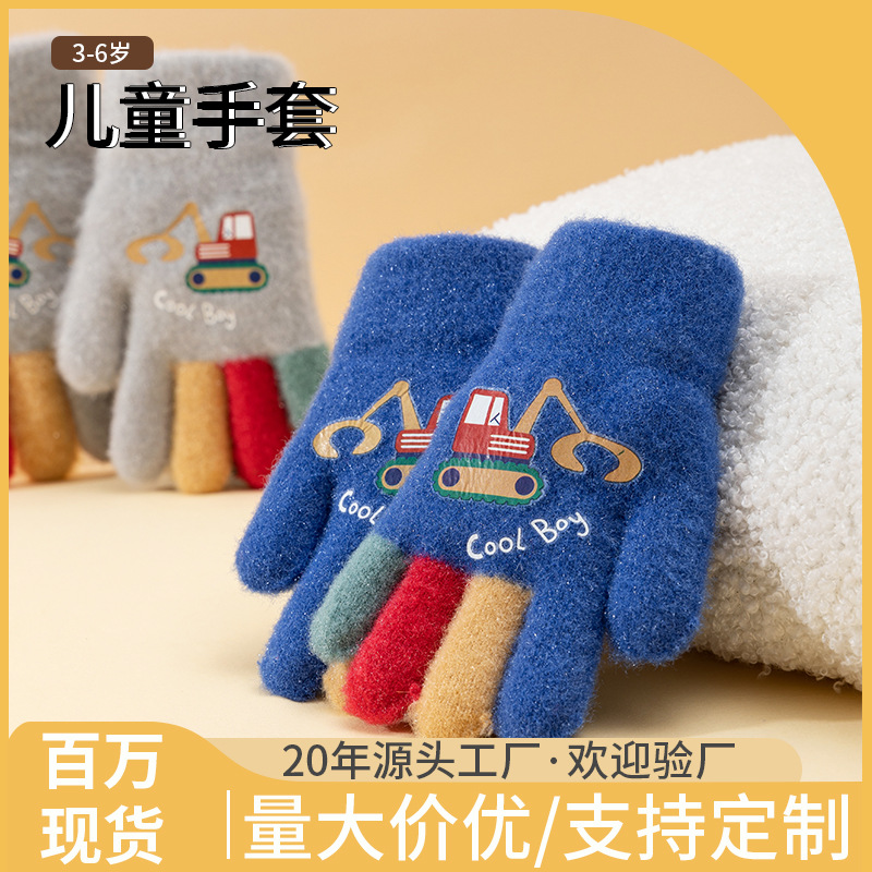 五指针织挖掘机抓绒加厚保暖幼儿园男宝宝秋冬季毛线儿童手套小童