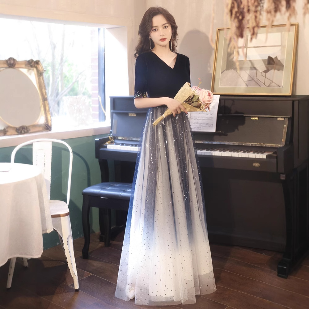黒のドレス2024新作宴会女性気質名媛司会者ロングスカート端正大気芸考成人式
