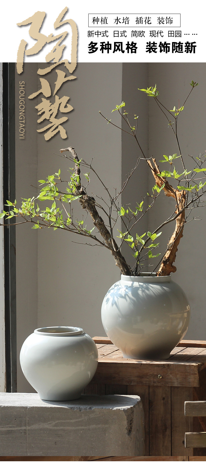 新中式白色花瓶插花种树花盆侘寂风客厅民宿大号月亮罐白昼瓶