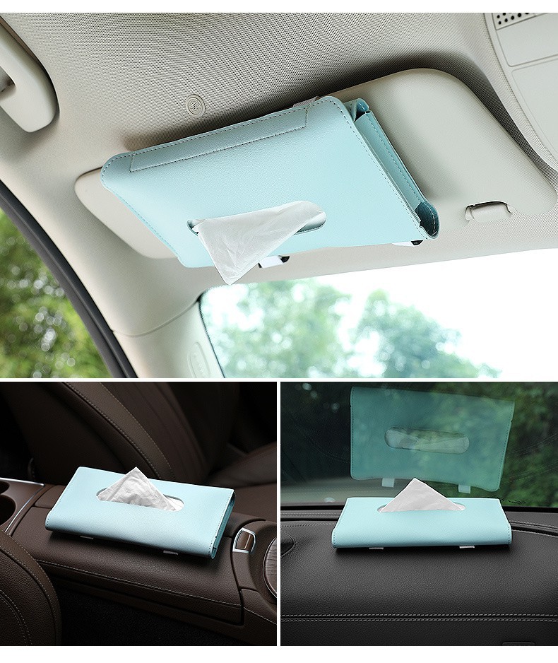 車の革のティッシュの箱の創意的な車の上で吊り式の日よけ板の背もたれの引き出しの箱は自動車の皮革のティッシュの箱を挟みます。