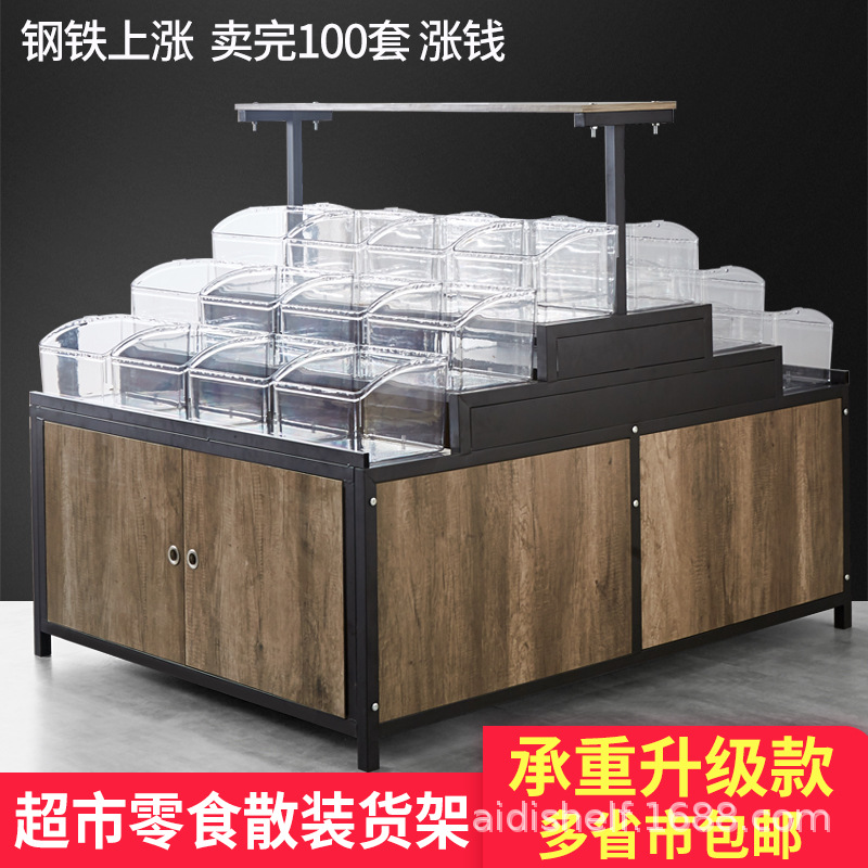 スーパーの棚はばら売りの間食展示棚のばら売り箱の売店の食品の中島の箱のキャンデーの干物の積み重ね
