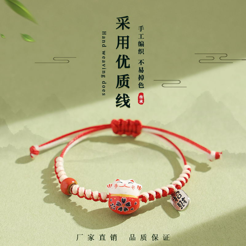 新款招财猫蜡线陶瓷猫红绳手链可调节男女情侣编织手链手绳批发