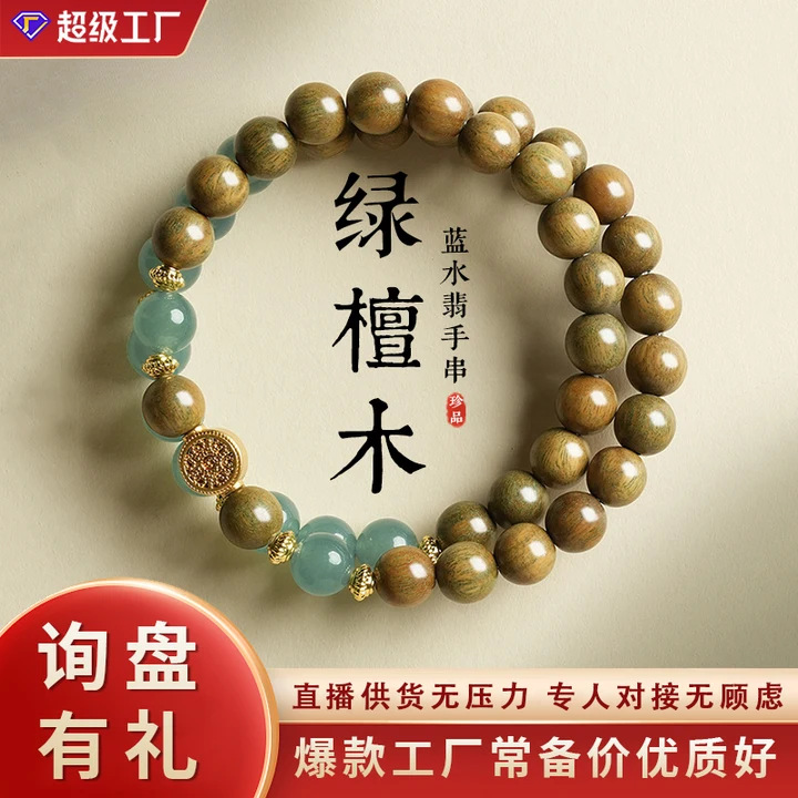 天然绿檀手串木串珠手链女蓝水翡新中式男款檀香木质文玩直播货源