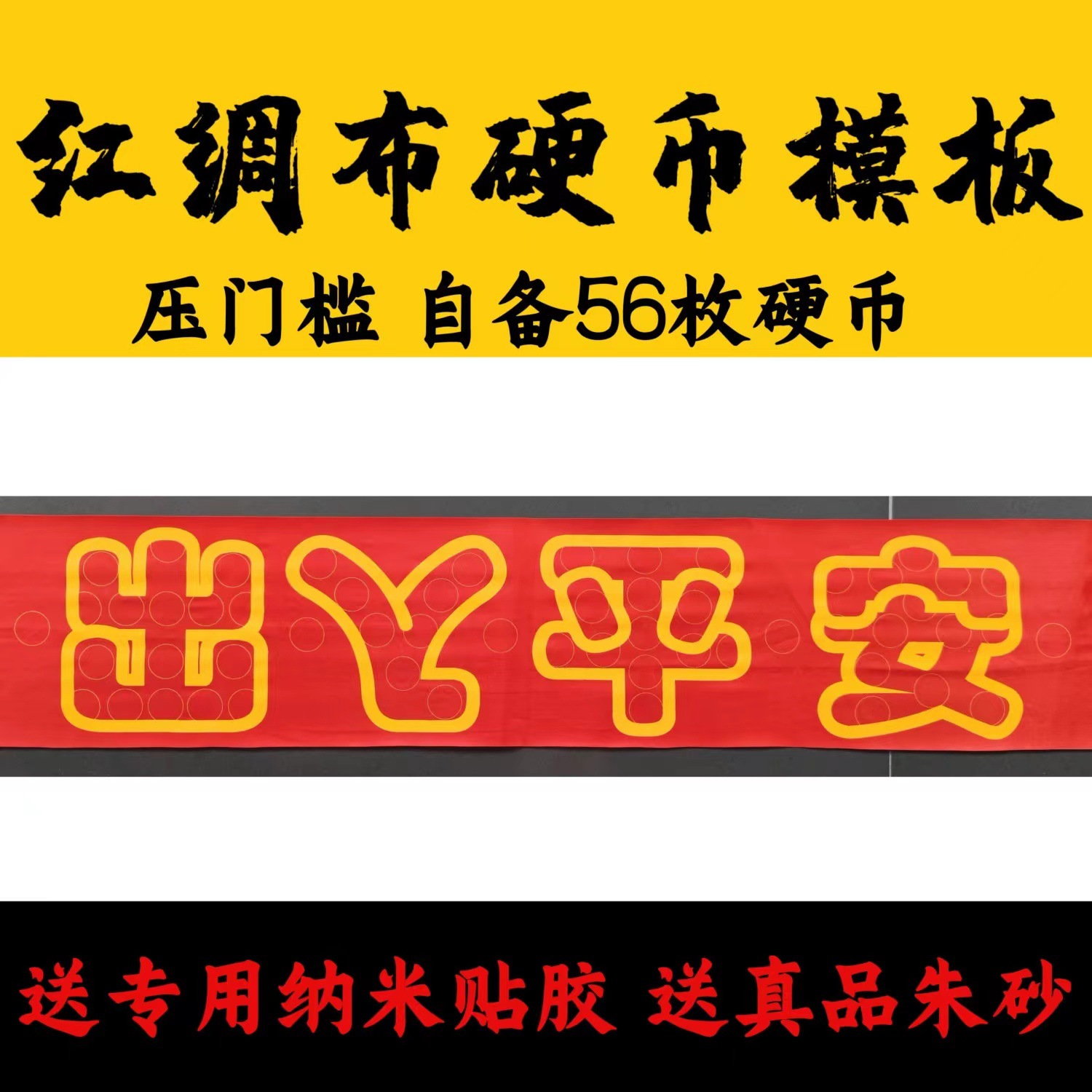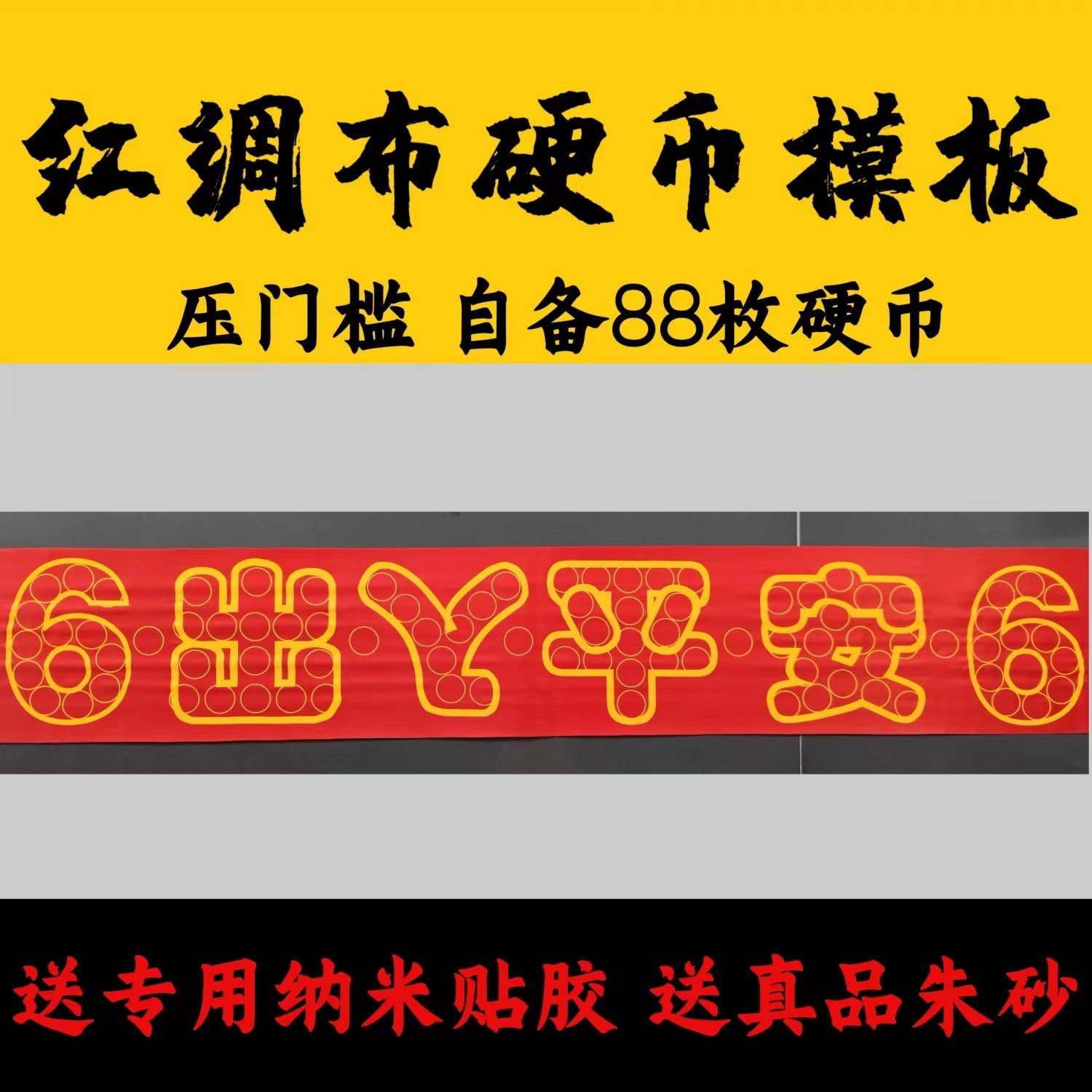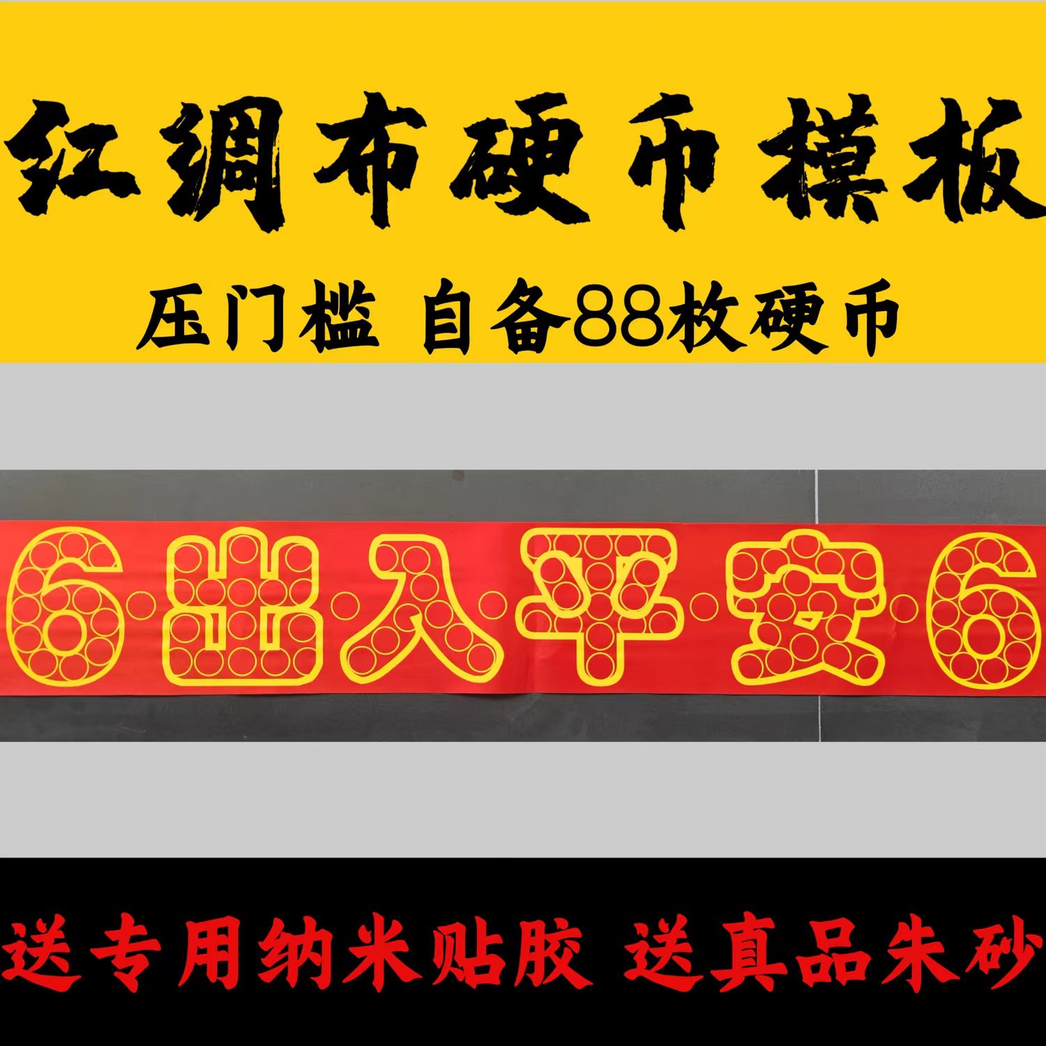 敷居押え【出入り銅貨テンプレート】五角硬貨88枚、五帝銭、門石66枚、赤い布、辰砂