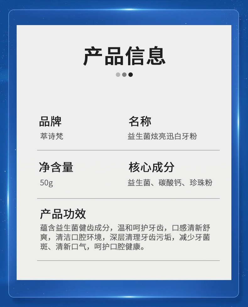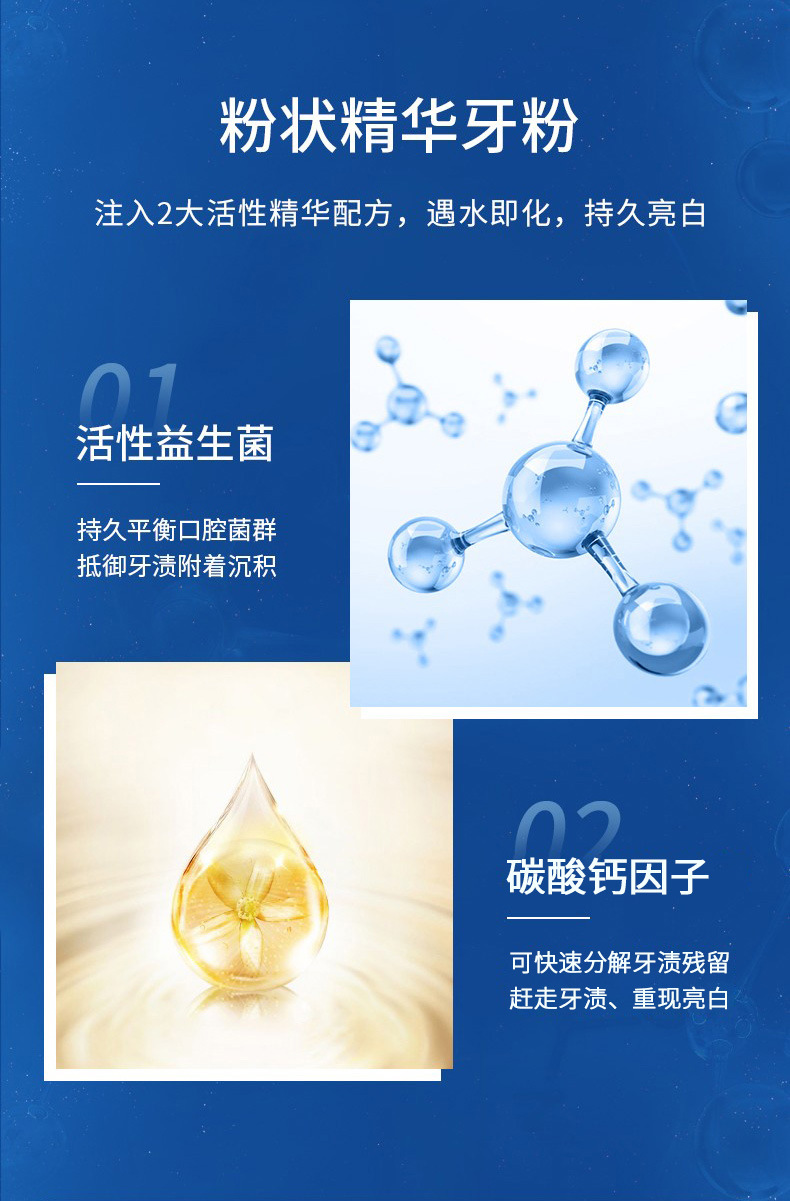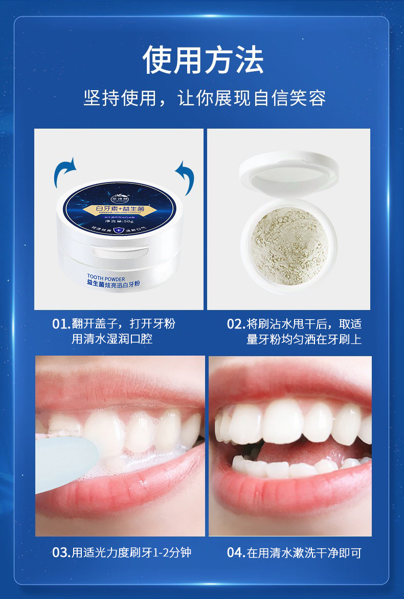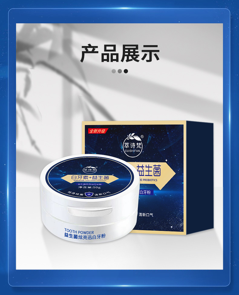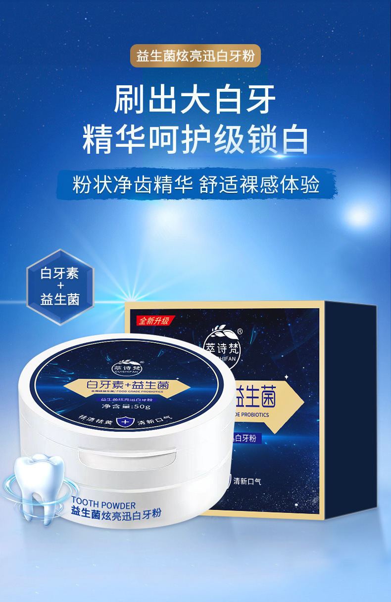 貨物番号 詩梵益生菌が速くて白い歯の粉 (青) を見せびらかす。