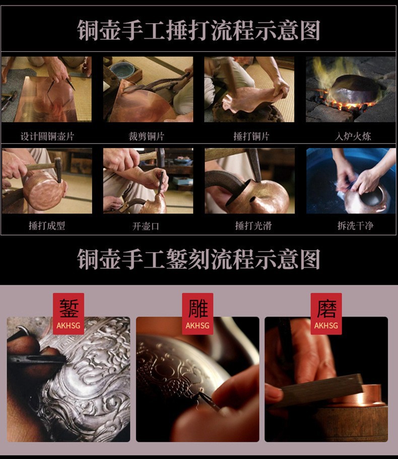 メーカーが手でハンマーをたたいて紫銅壺茶器で水を沸かします。