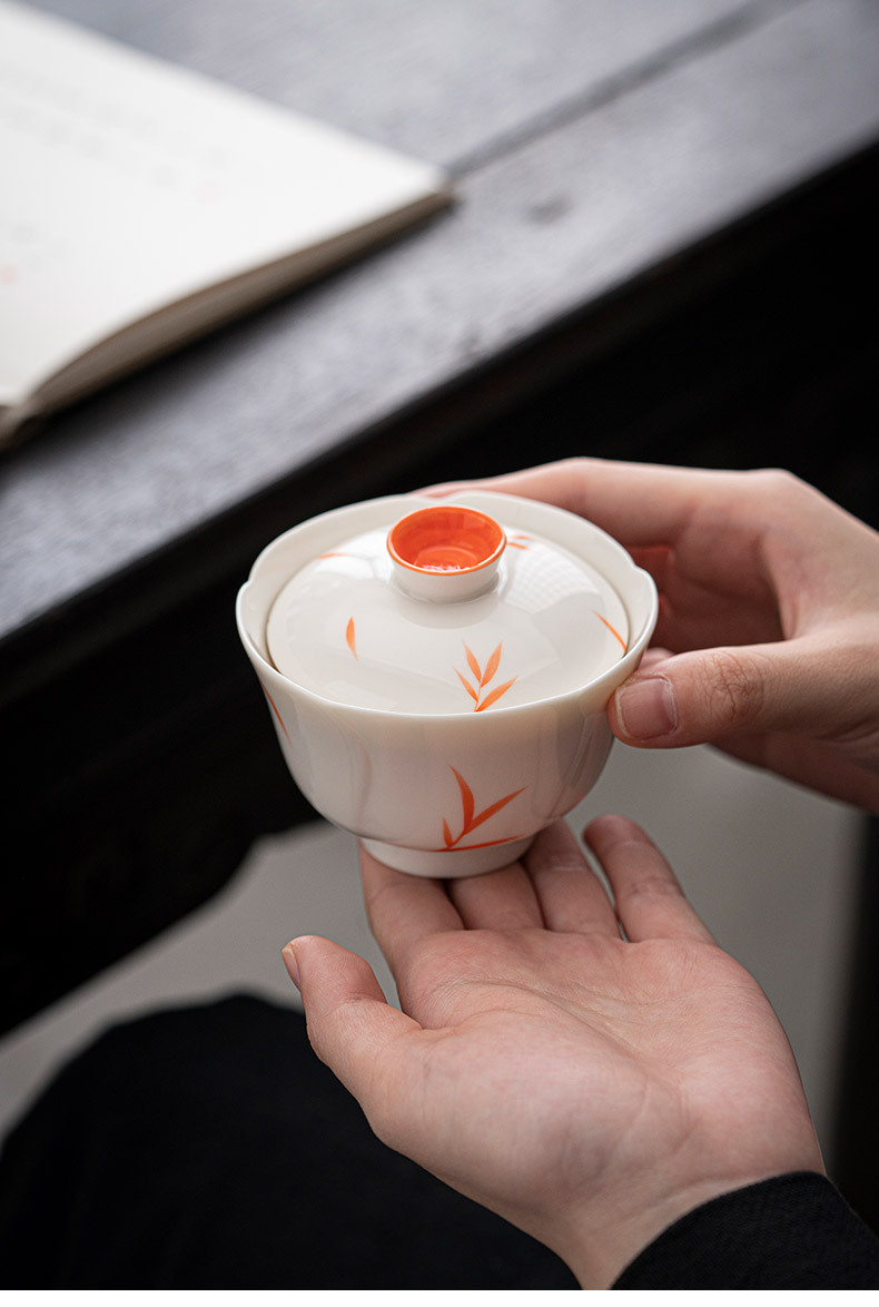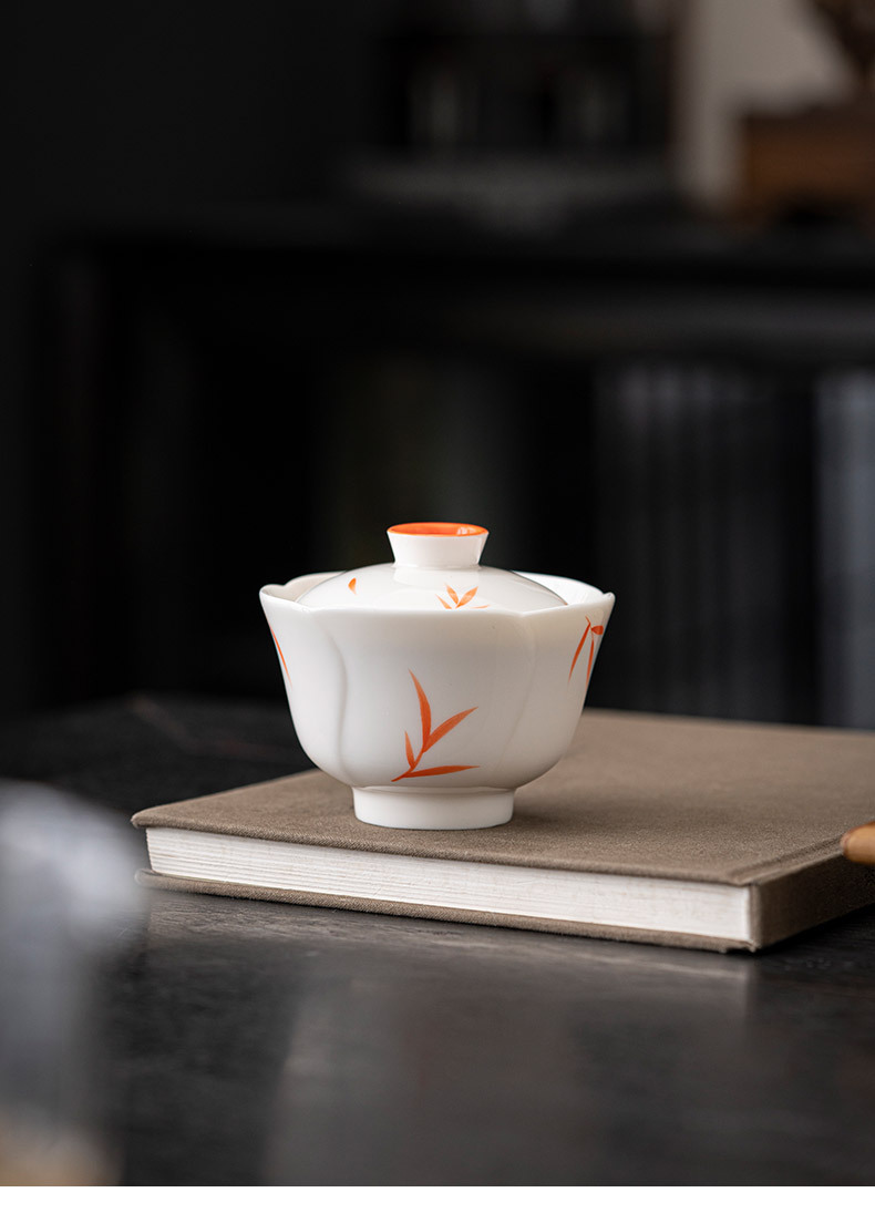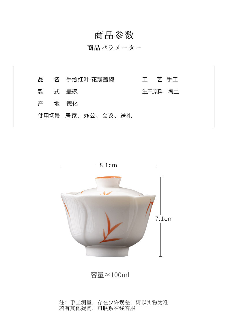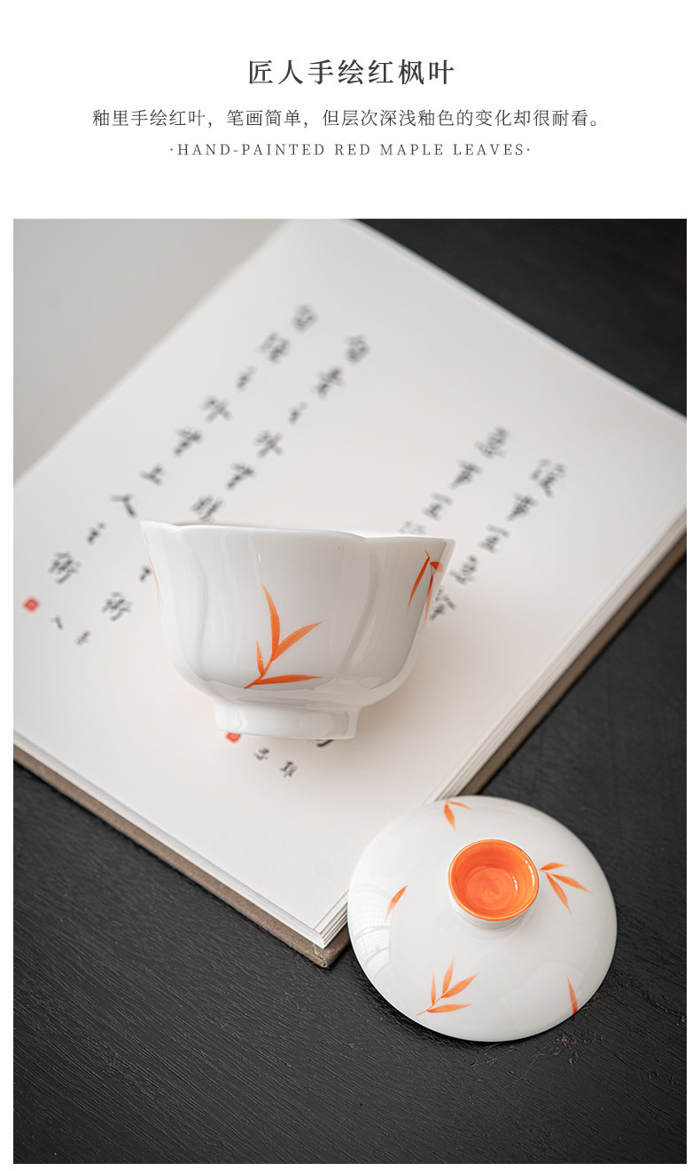 手描きの紅葉の白い磁器の蓋の工夫の茶器の家庭用の客は蓋を持ってお茶を入れます。