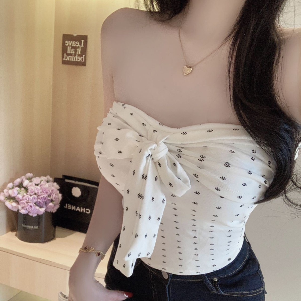 66020#人棉波点复古抹胸一字围美背女纯欲蝴蝶结吊带背心打底上衣