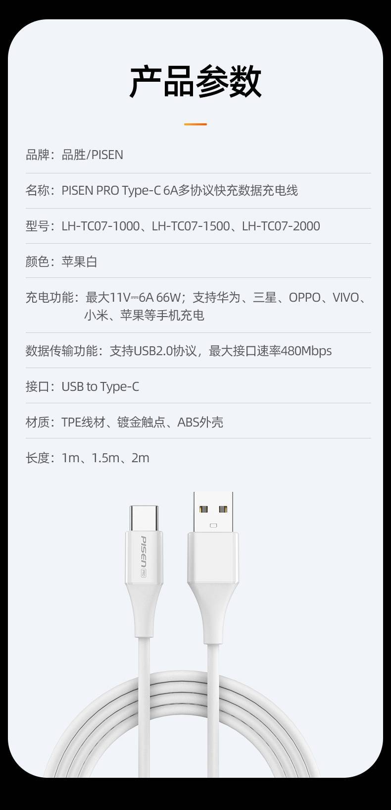 品勝製のType-Cデータケーブルは、Huawei、Honor、OPPO、Xiaomi、vivoの充電ケーブル、6A急速充電ケーブル、Androidケーブルに適しています。