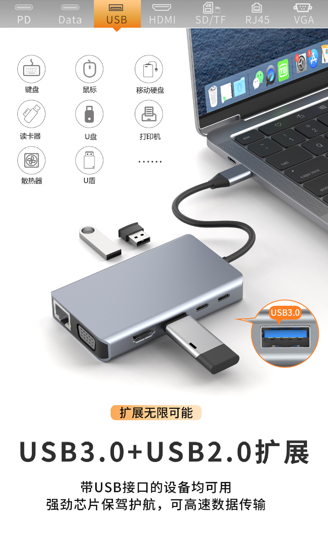 2ドラッグ8 usbエクステンダー高速hubハブ7ポート拡張ドック・スプリッタ多機能コンピュータ拡張ドック