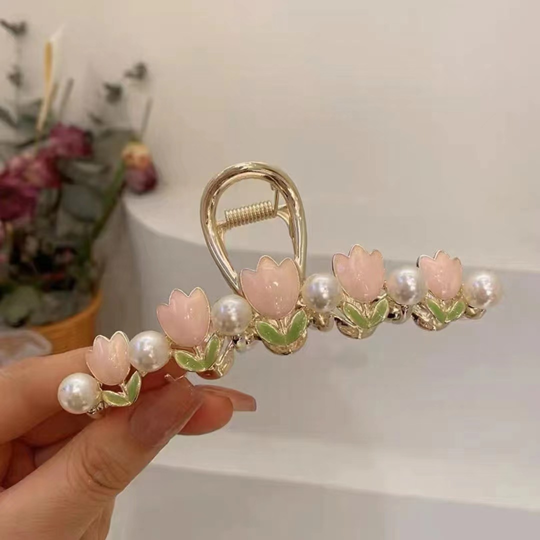 カラー チューリップ深粉,チューリップ薄粉,クチナシの花,蝶流蘇,蝶の花のフリンジ,金色の猫眼麦穂,黒い猫の目の麦の穂,猫の目の白いチューリップのツイストクリップ,パールバタフライ