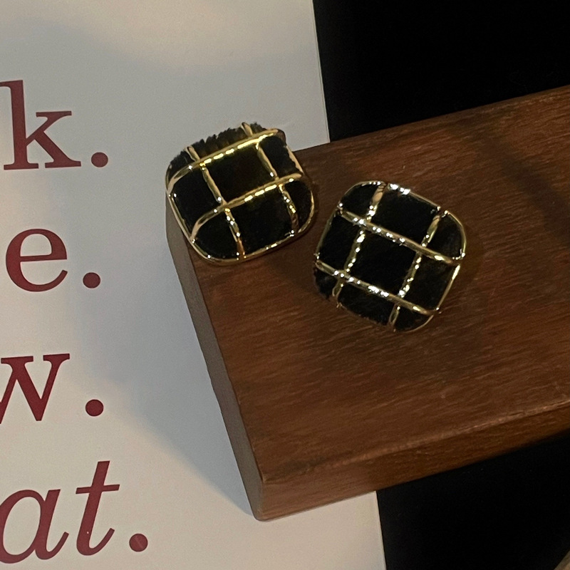 S925銀針新型ネットレッド気質レトロファッション耳飾り女性個性植毛金属格子正方形ピアス