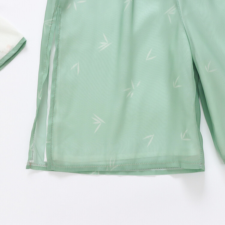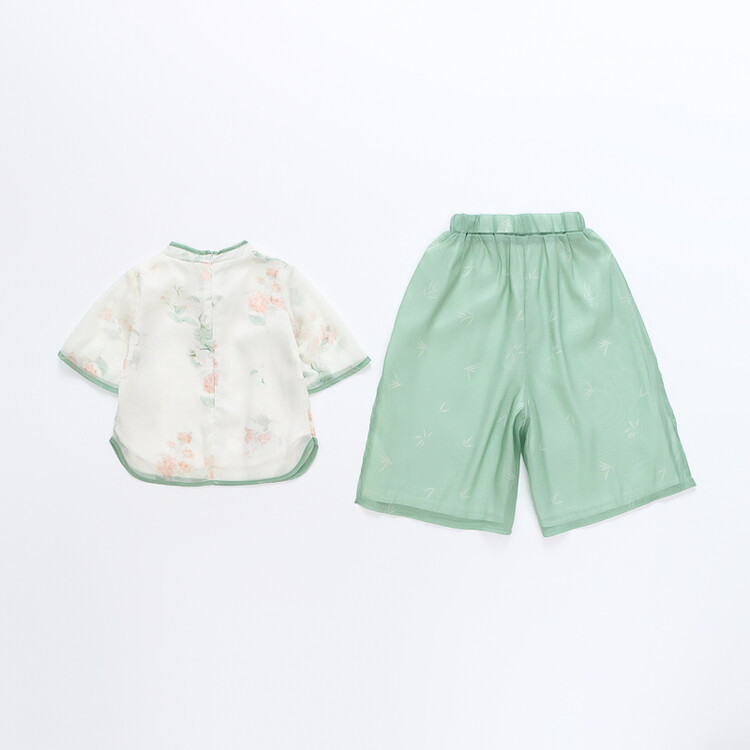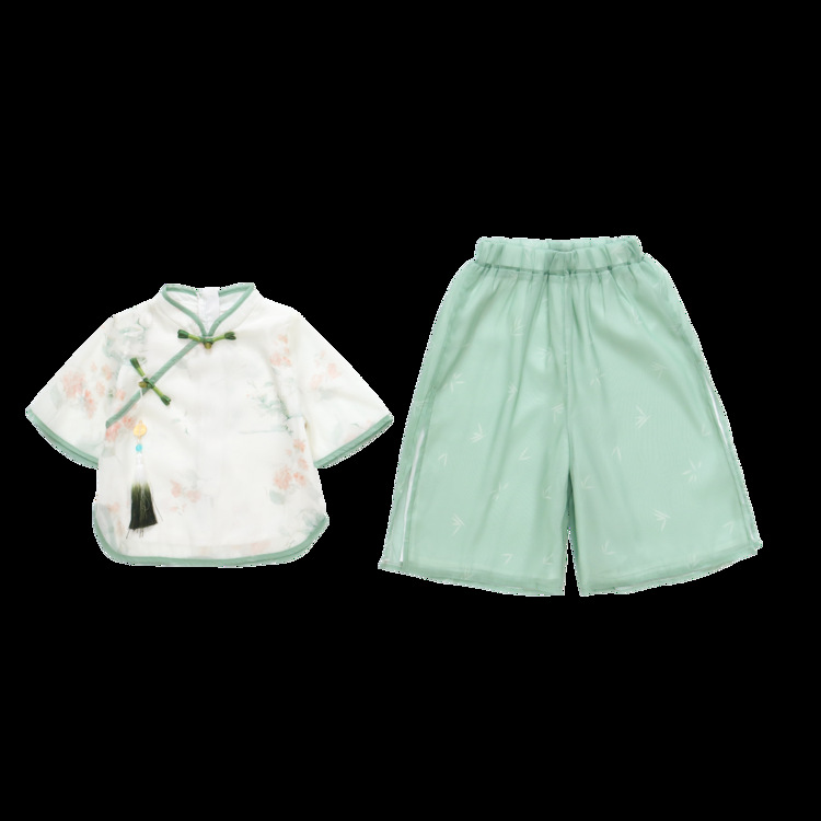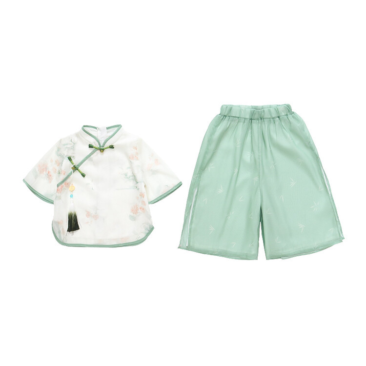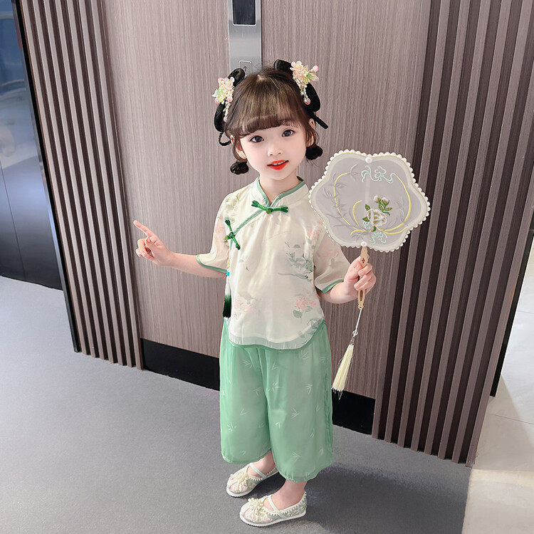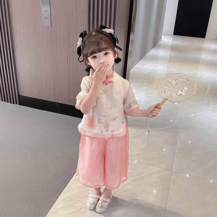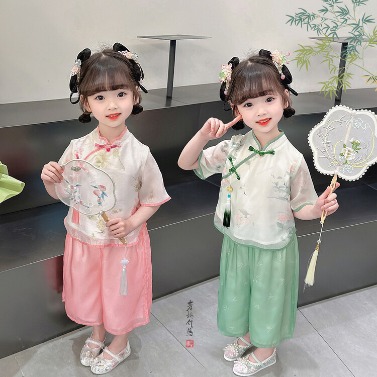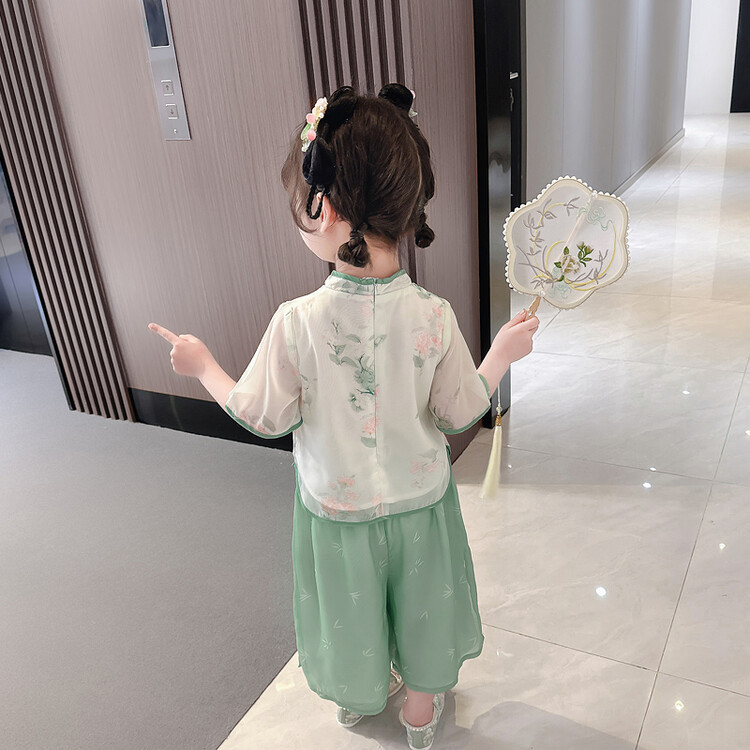 2021夏の新しい女の子の漢服刺繍ハスの花綿麻セット透かし彫り中国風女の子唐服2点セット