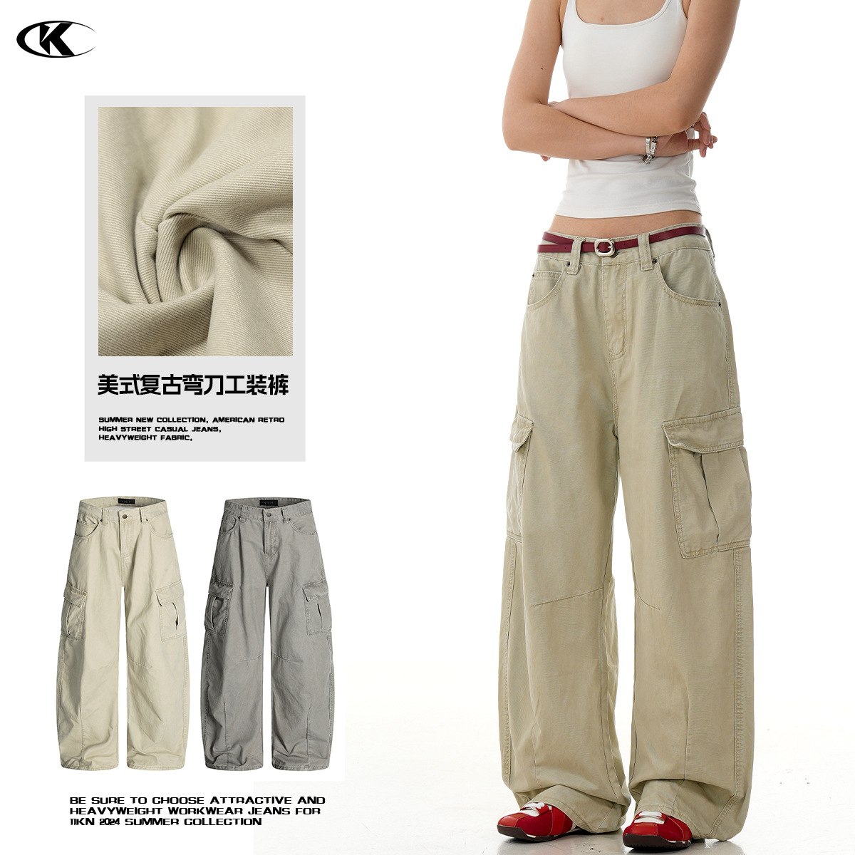 11KN アメリカンレトロシミターオーバーオール男性と女性のだぶだぶスリムストレートルーズカジュアルマルチポケットトレンディパンツ