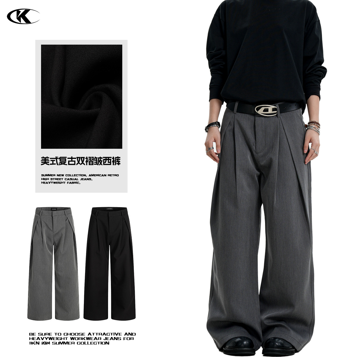 11KN アメリカンレトロシミターパンツ 立体裁断プリーツ カジュアル ゆったり 男女兼用 クリーンフィット シンプルパンツ