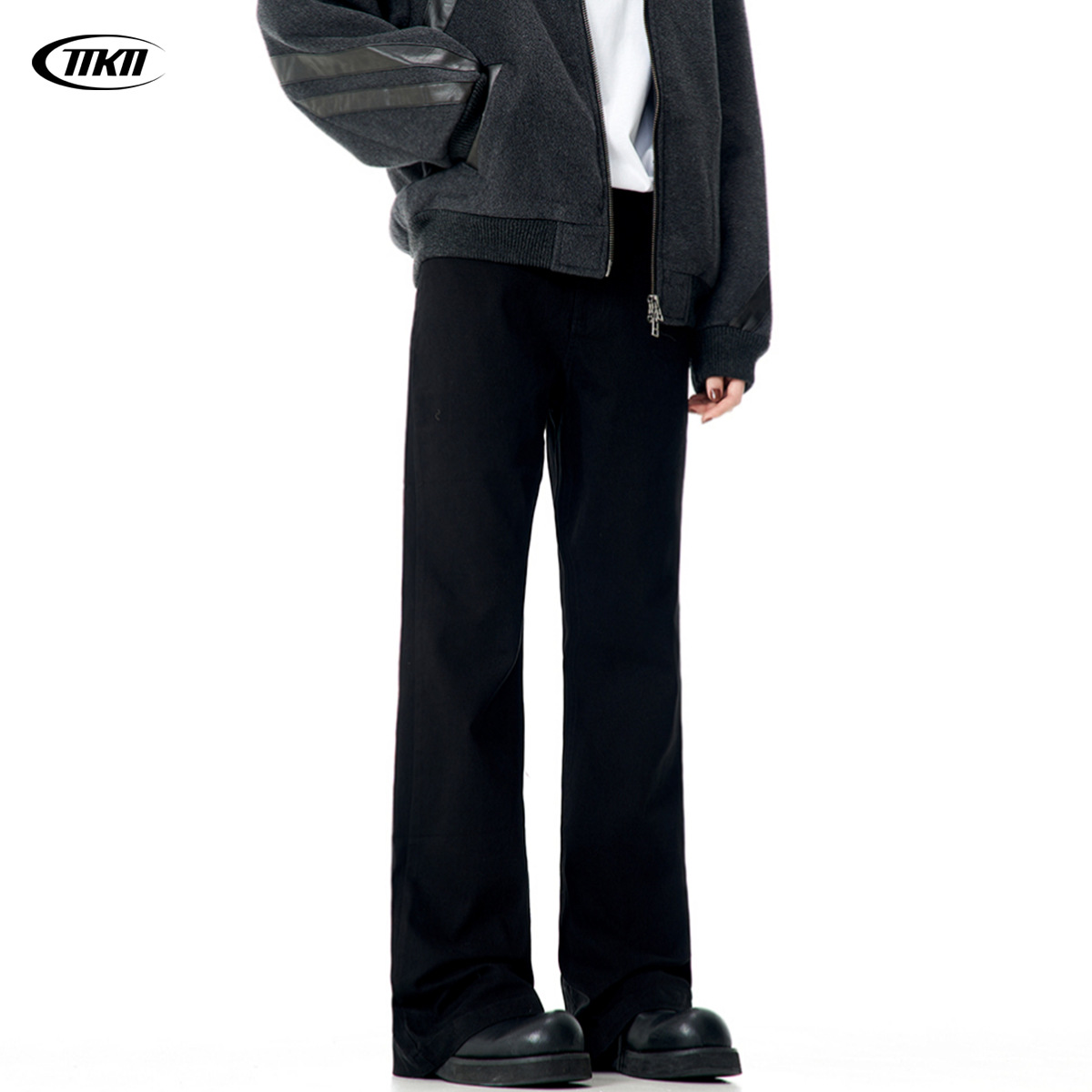 11KNアメリカンスタイルのドレープ感のあるマイクロフレアブラックジーンズ、男女兼用、ベーシックで万能、着痩せ効果のあるクリーンフィット、カジュアルでトレンディなロングパンツ