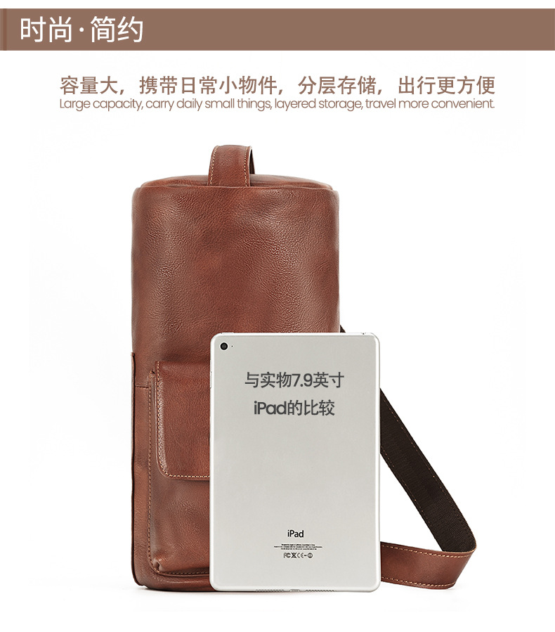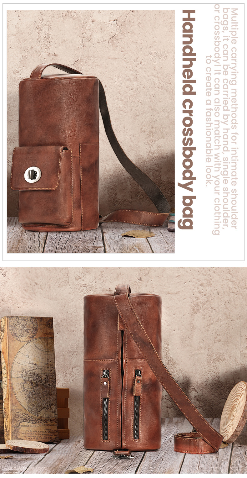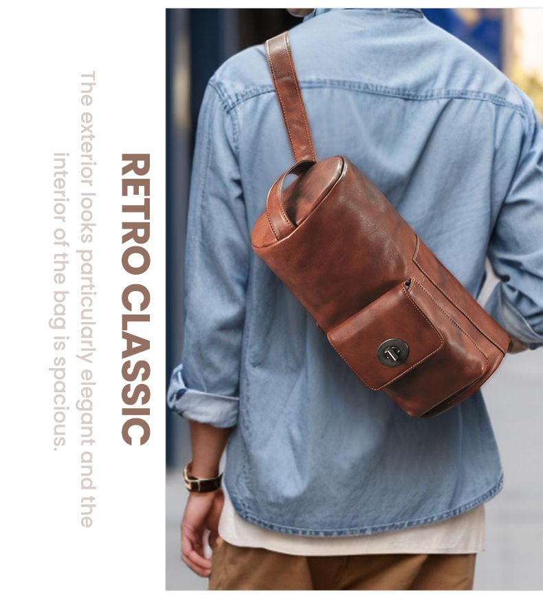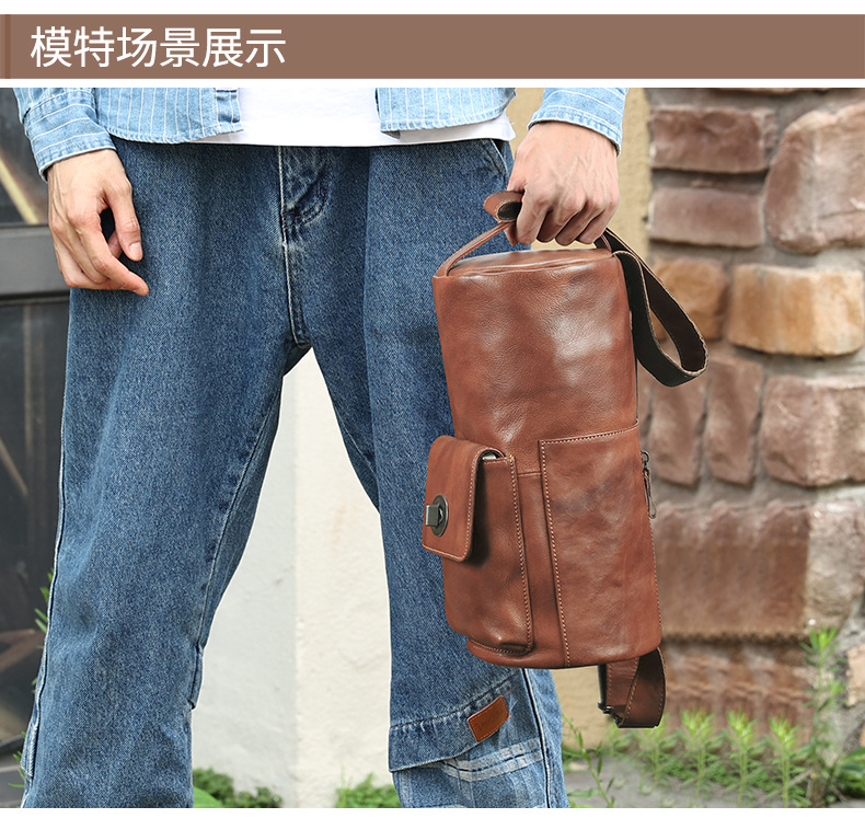 クロスボーダー貿易用斜め掛けバッグ、クレイジーホースレザー本革円筒型バッグ、メンズバッグ、ショルダーバッグ、レトロメンズチェストバッグ、軽量高級レトロ