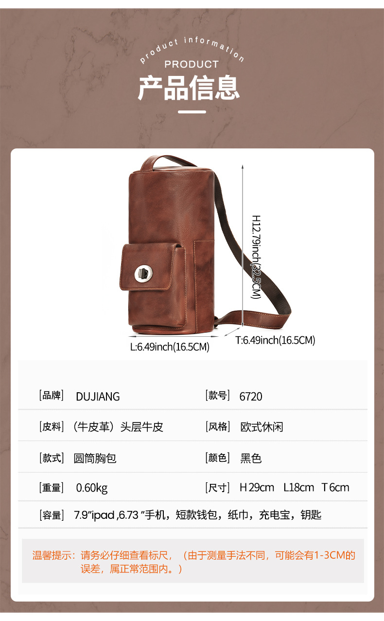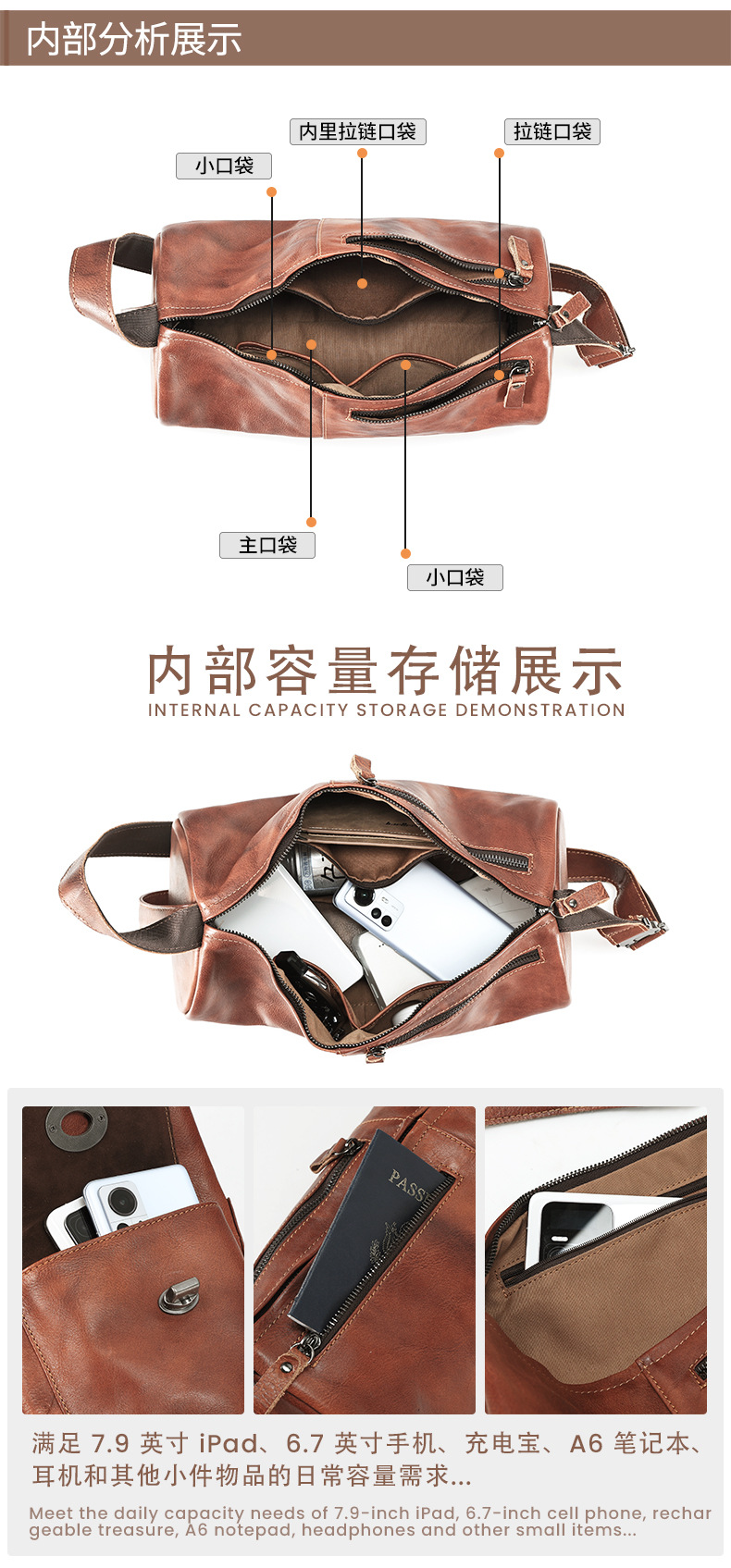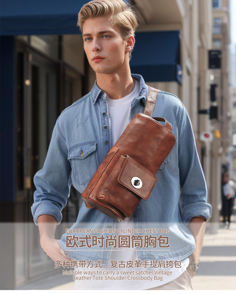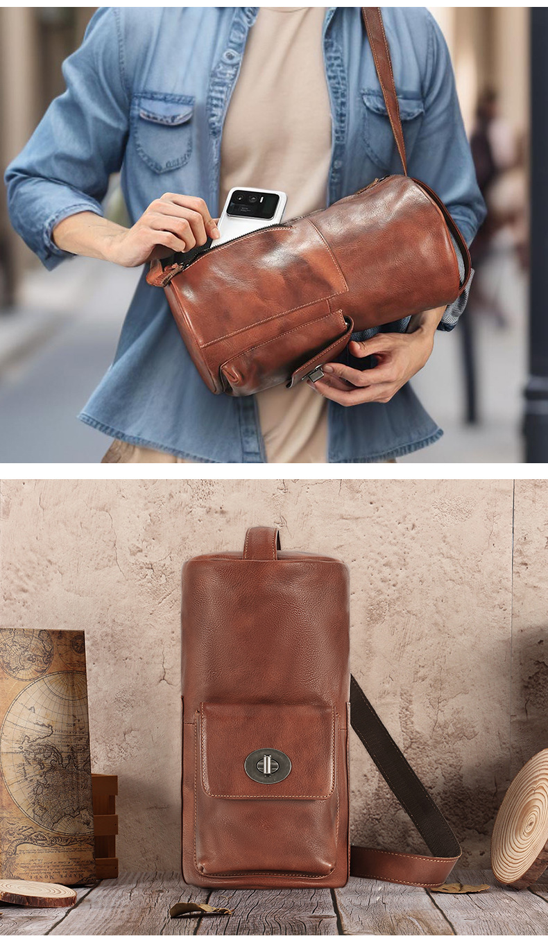 クロスボーダー貿易用斜め掛けバッグ、クレイジーホースレザー本革円筒型バッグ、メンズバッグ、ショルダーバッグ、レトロメンズチェストバッグ、軽量高級レトロ